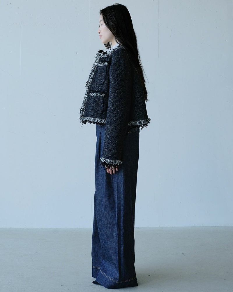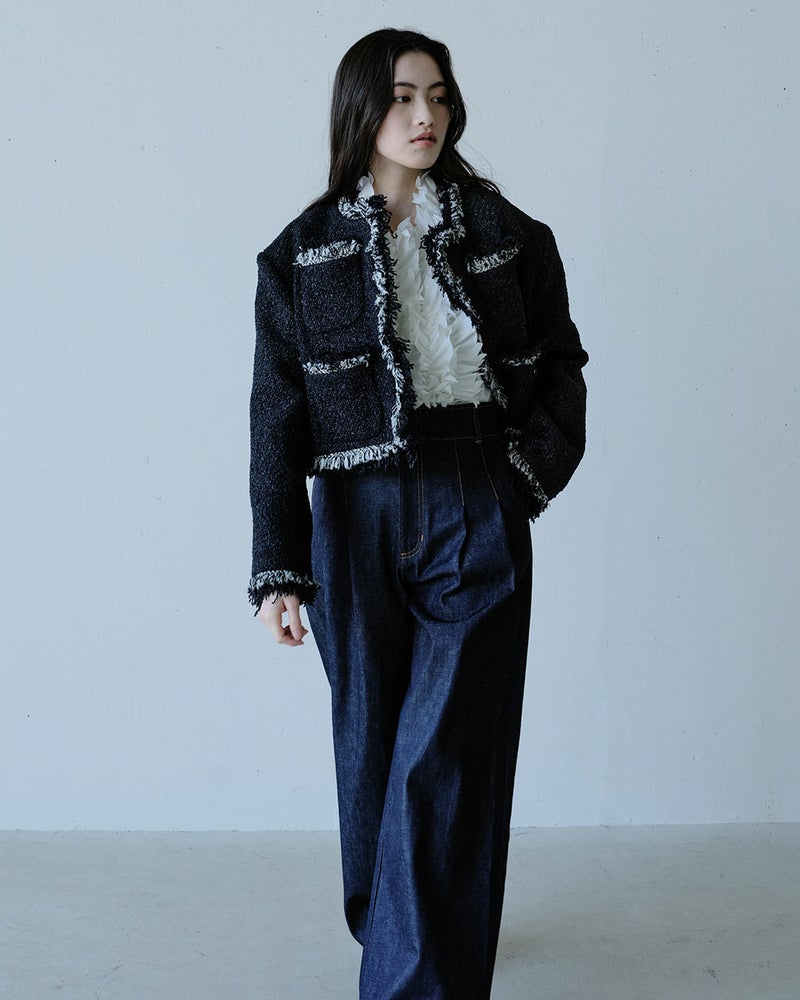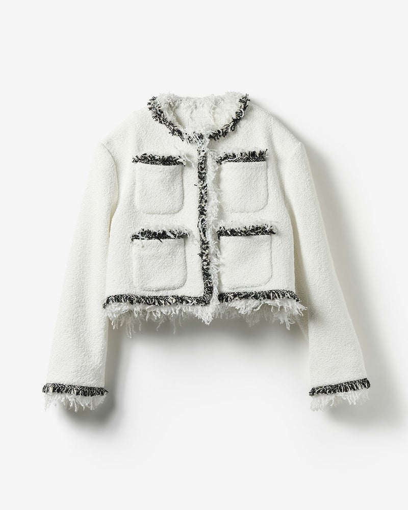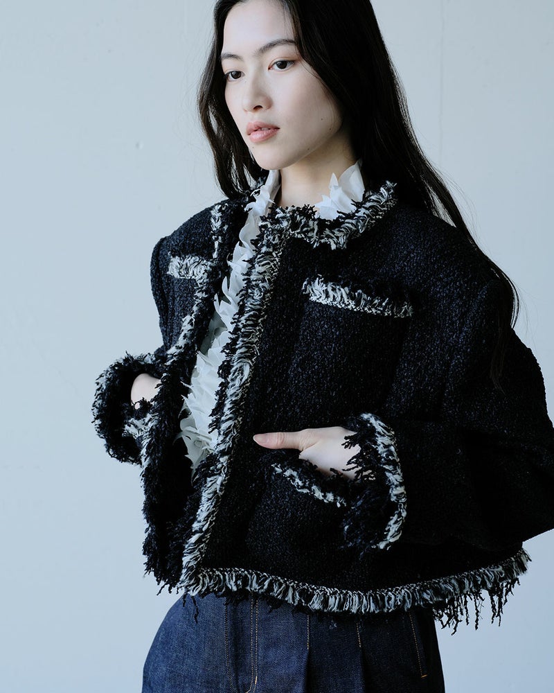 コンサバとは一線を画した、毛足の長い意匠糸が遊び心あふれるツイードジャケット。ノーカラー、トリムでノーブルな雰囲気を醸し出しつつ、背中部分にゆとりをもたせたシルエットが、エフォートレスな着心地も実現。コットンをベースにした生地にはラメ糸を織り込み、上品なきらめきにより奥行きのある風合いに。華やぎを添えたいオケージョンやパーティシーンでも映える1着。