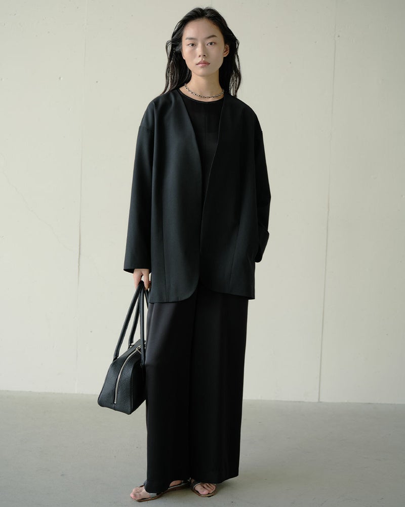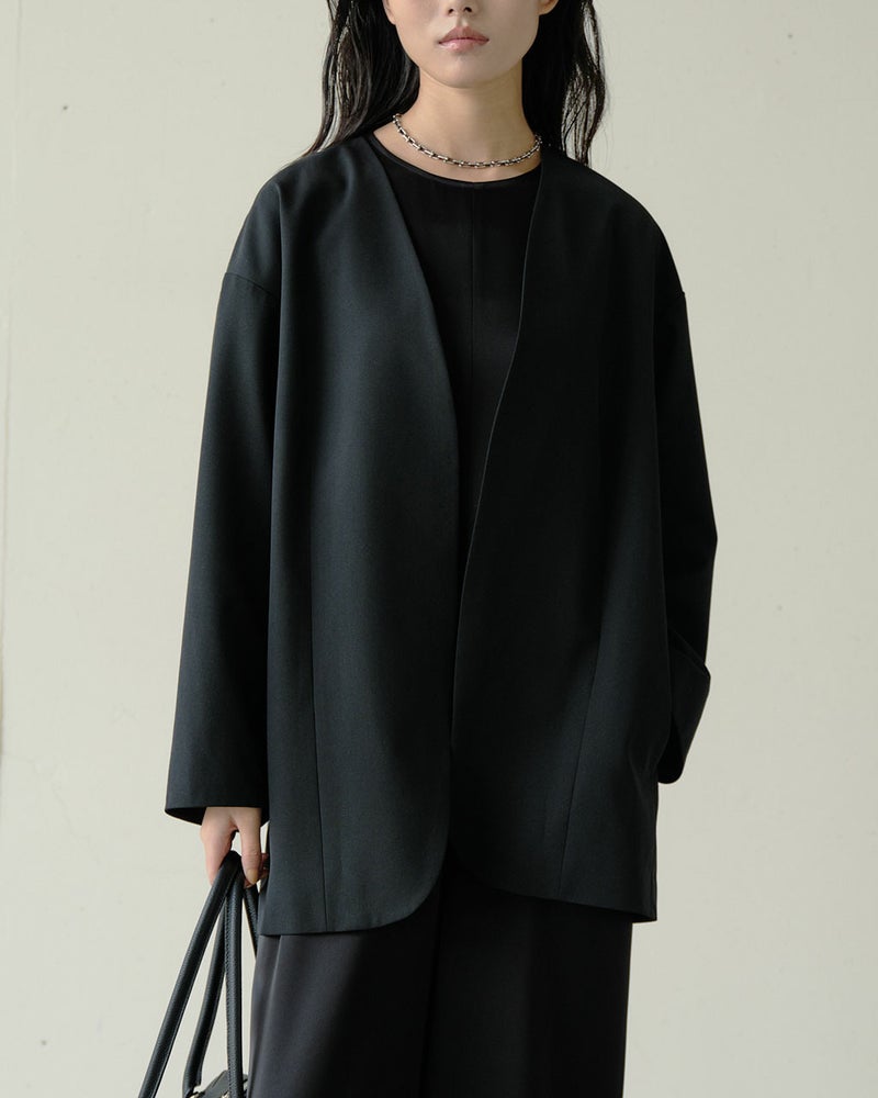 さっと羽織るだけでこなれた空気感が生まれる、ノーカラーの羽織りジャケット。ヒップまですっぽり隠れるオーバーサイズ&ノーボタンで、軽いアウターのような使い方もできる1着。光沢のあるツイル素材は、ウール本来の風合いを最大限に生かしながら、適度なふくらみとしなやかな落ち感を叶えた上質な表情。さらりとドライな着心地も魅力。同素材のボトムス(品番:14789ドライタッチツイル・ハーフパンツ/14792ドライタッチツイル・バイアスワイドパンツ/14817ドライタッチツイル・バイアスロングスカート)も豊富に揃っているので、あなたらしさをひき立てるセットアップが可能に。