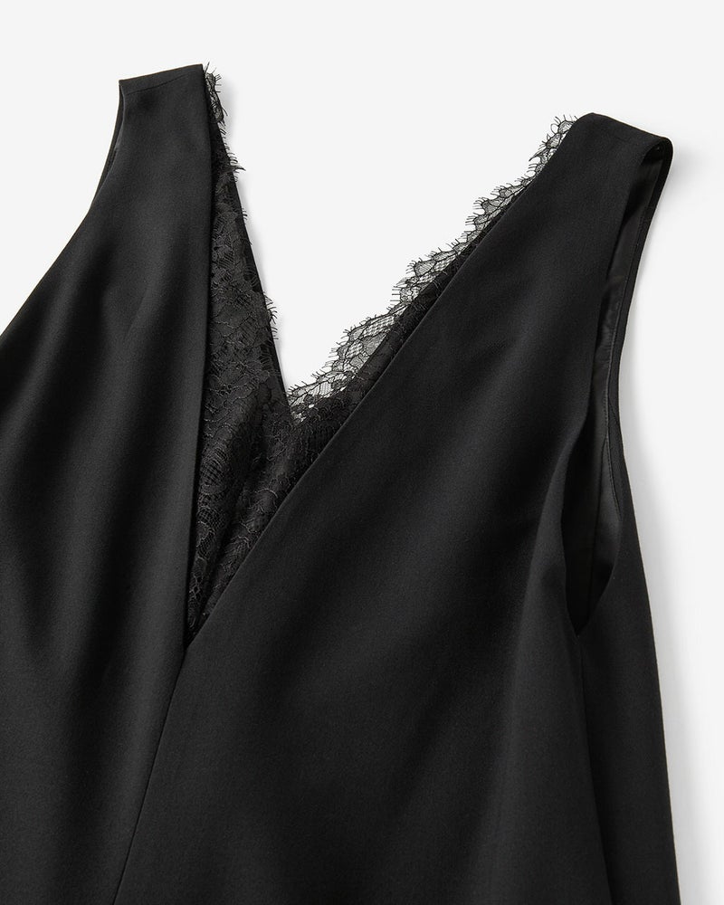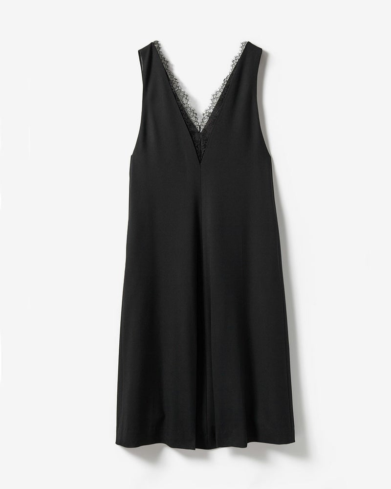 ジャケットの下に1枚で。シャツやTシャツの上に着て、コンビネゾン風に。合わせるアイテムや着るシーンによって表情を変える、シンプルエレガントなワンピース。カシミヤを思わせるツイル素材は流れる落ち感が美しく、繊細な起毛加工により、肌を滑るような、なめらかな着心地。フロントのV部分にはレースを覗かせ、ノーアクセサリーでも優美なたたずまいに。