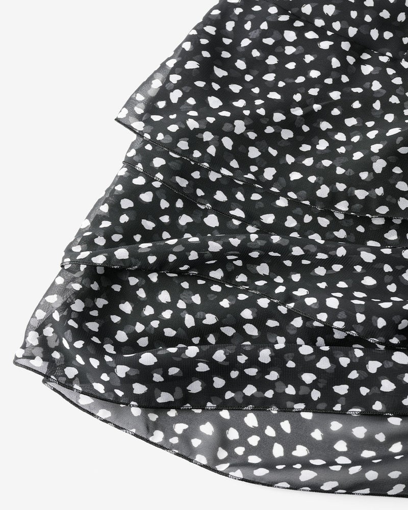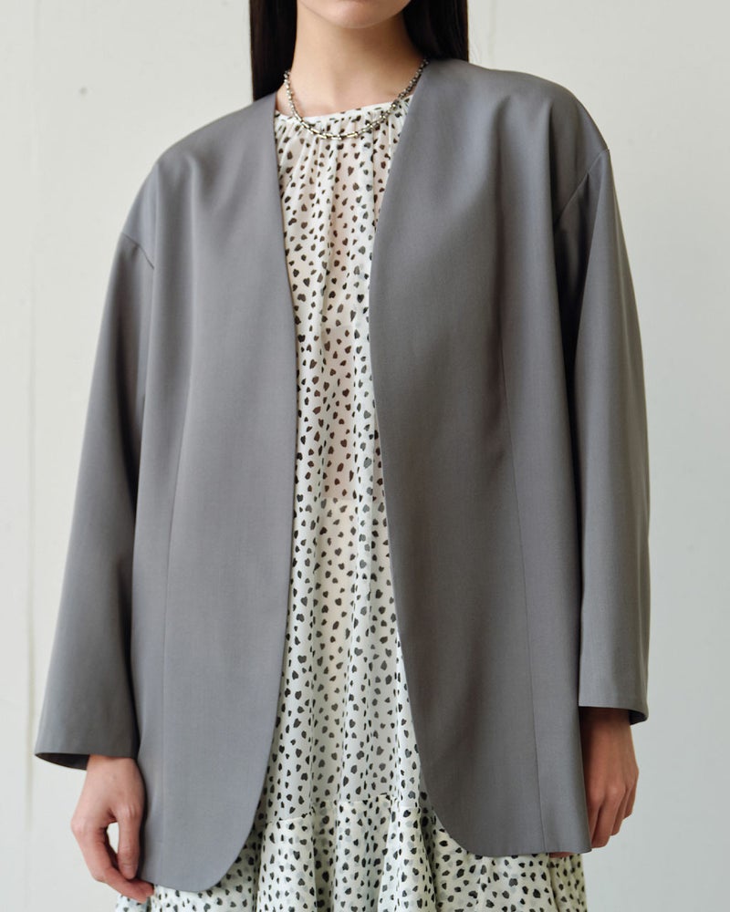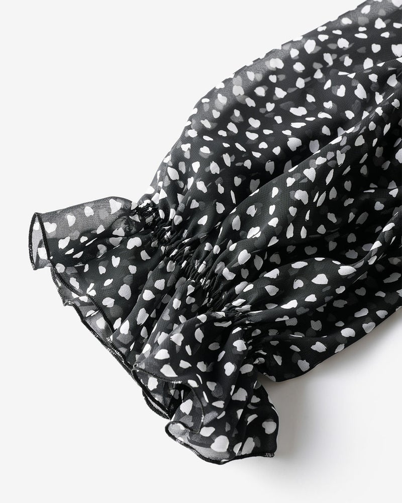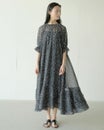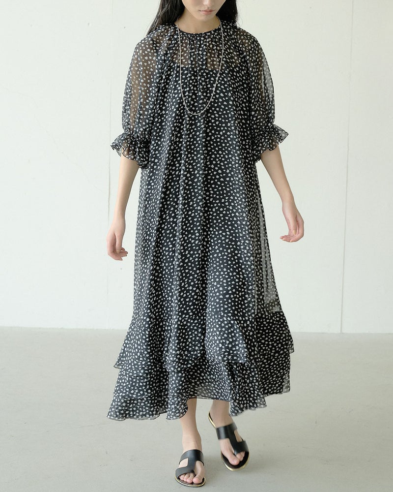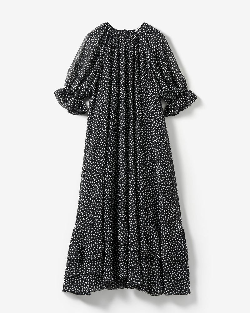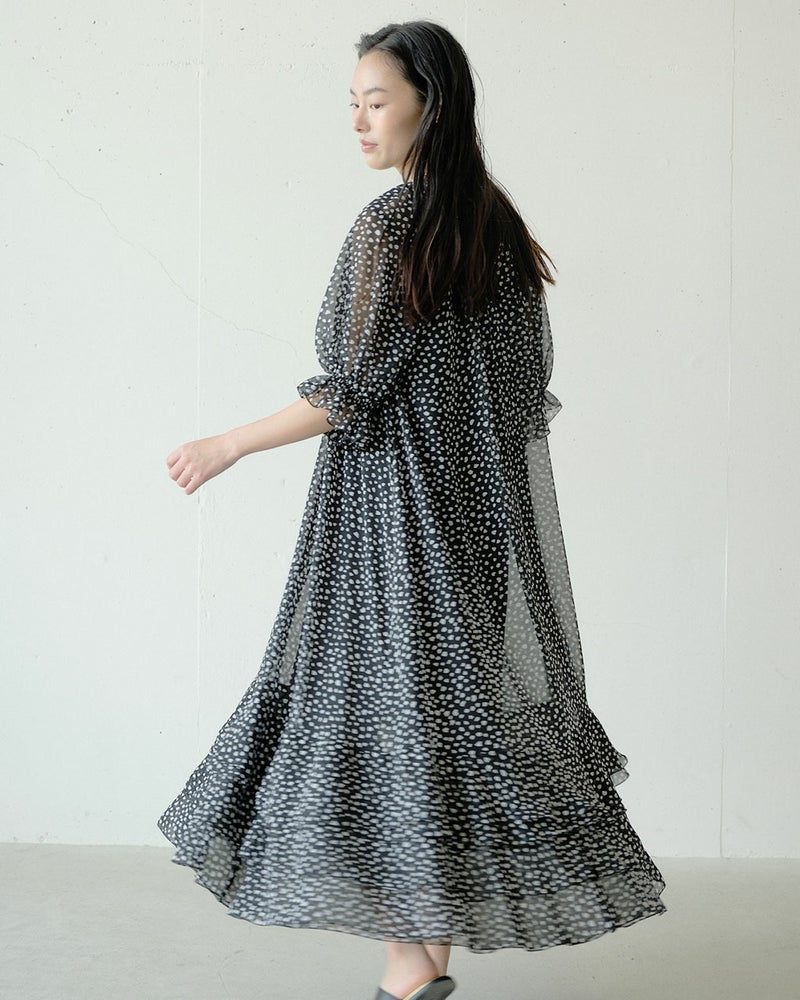 贅沢なほどふんだんにシフォンジョーゼットを使い、中で身体が泳ぐような絶妙なカッティングに。ジョーゼットならではの透け感やドレープ感を、心ゆくまで味わえるワンピース。重さを極力抑えた加工で、ふんわりと柔らかな風合いに仕上げたシフォンジョーゼットは、京都の染色工場でプリントを実施。ランダムなモノトーンのドット柄が、シルエットの甘さを中和して、繊細かつシックな表情に。軽さ、リラックス感、華やぎ、スタイリッシュ、そのすべてをこの1着に凝縮。