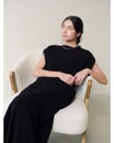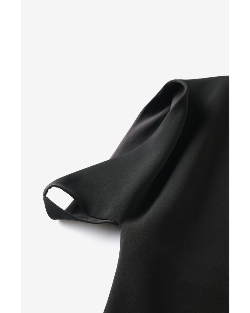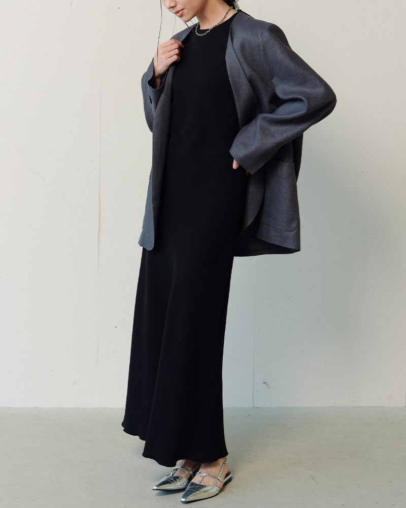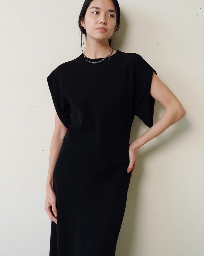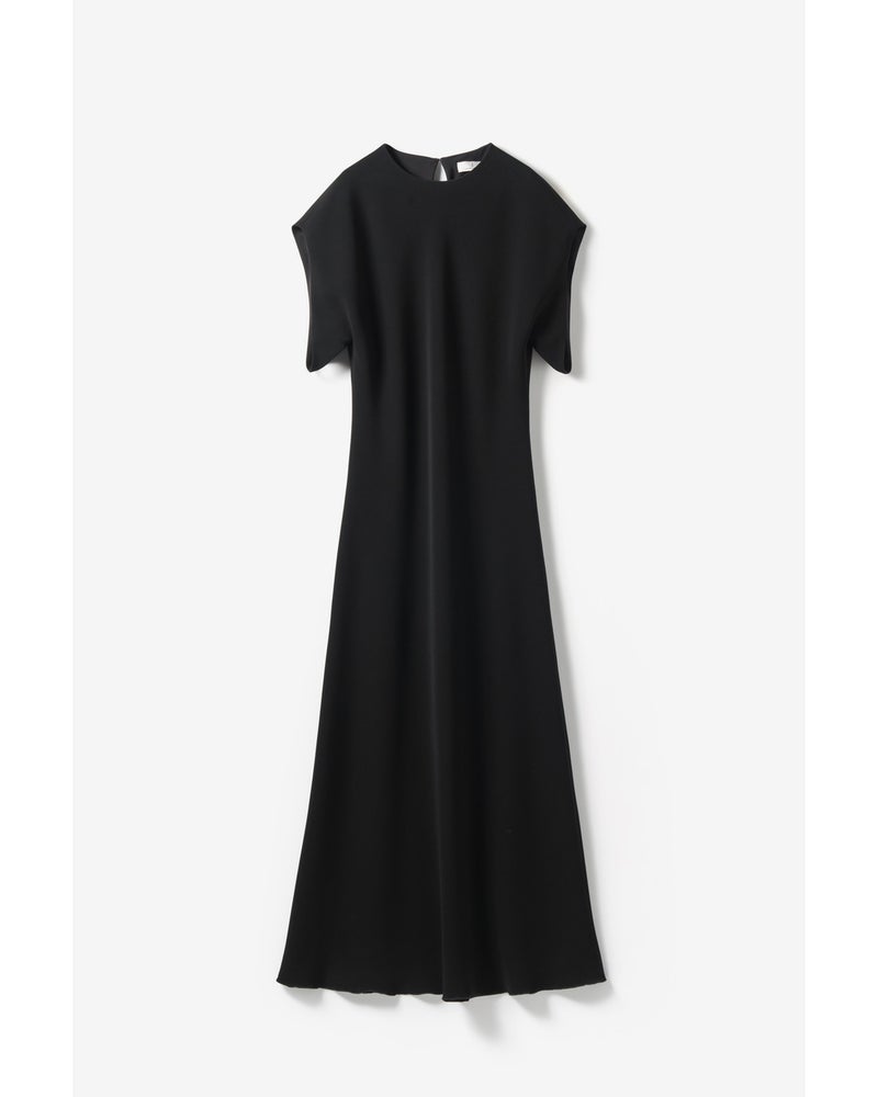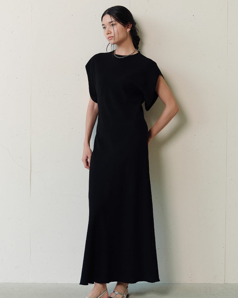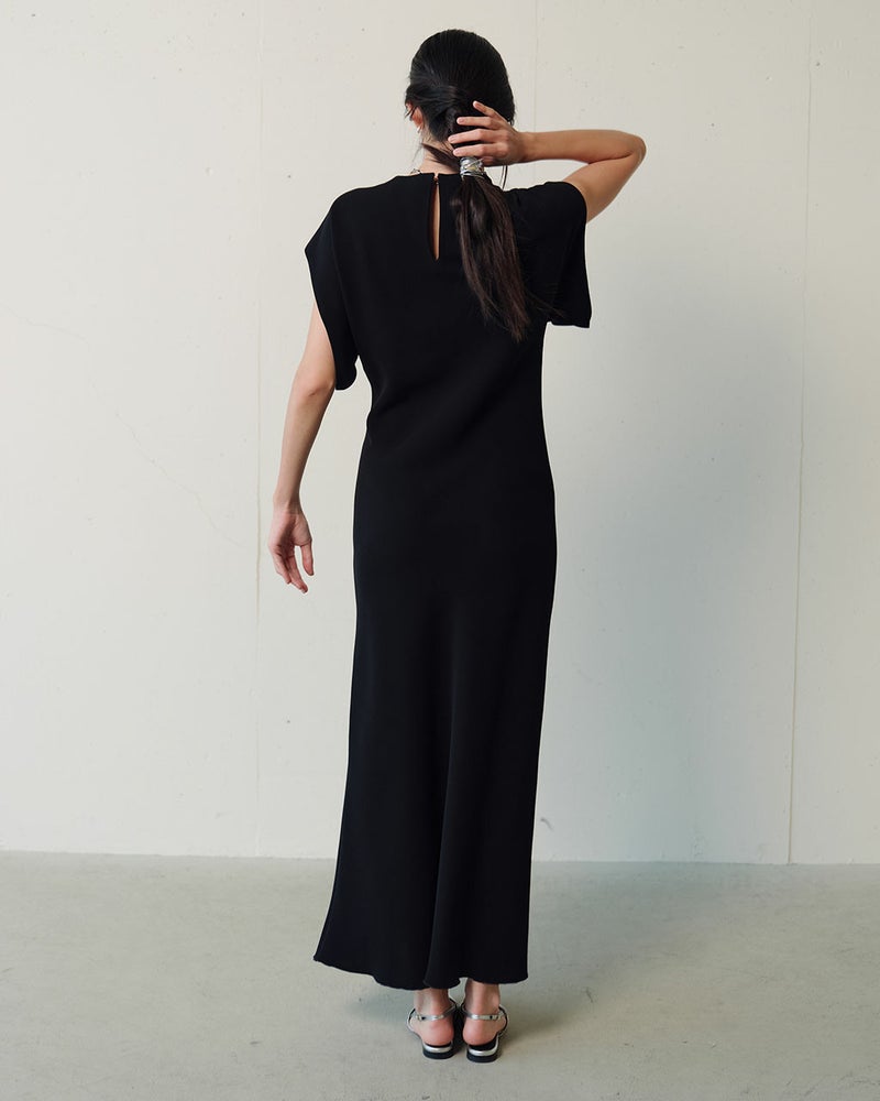 何気ない日常にも、特別な一日にも似合う、プレーンなフォルムのロングドレス。しなやかでエアリーなダブルクロスの生地をバイアスに使うことで、たっぷりと贅沢なドレープに。袖口を大きめにとったフレンチスリーブは、トレンドと華奢見えの両方を実現。ほのかな光沢をたたえた黒が、大人の肌を美しくひき立てる効果も。