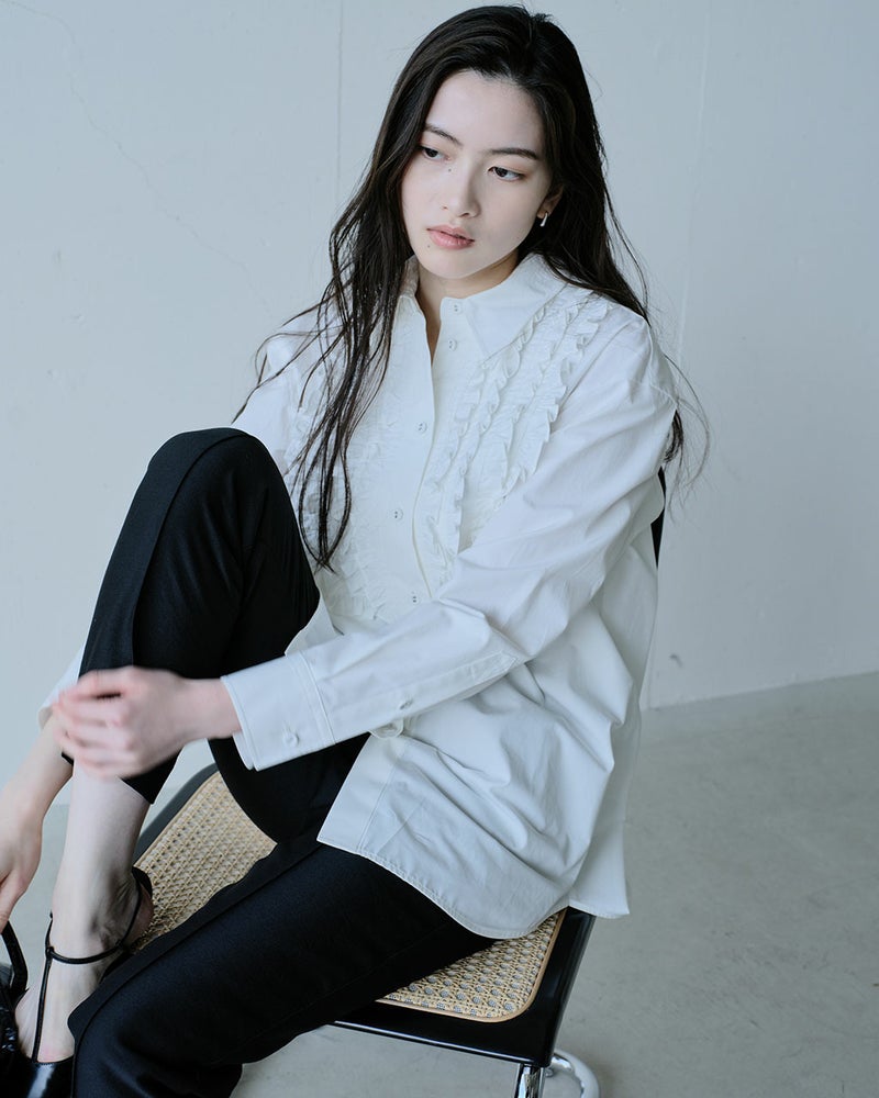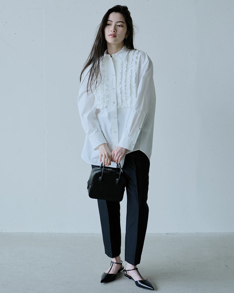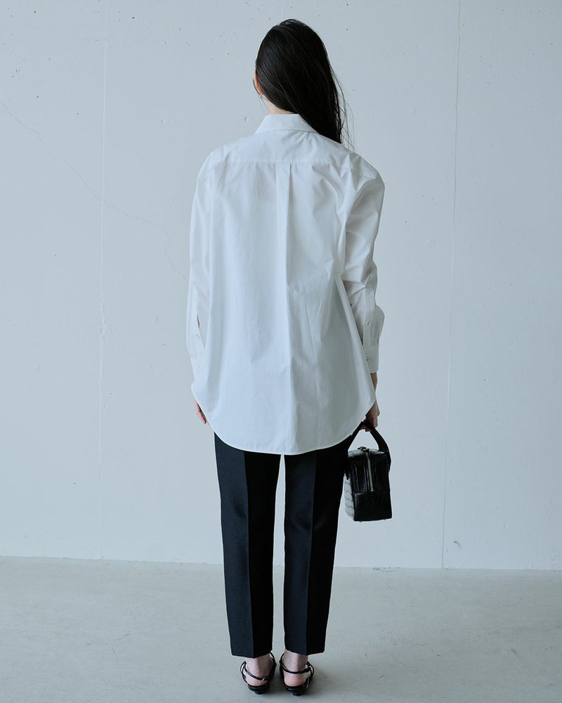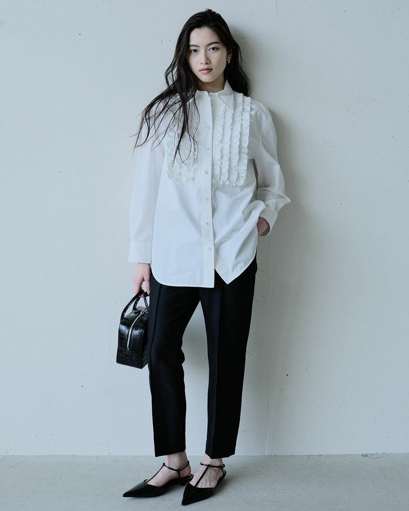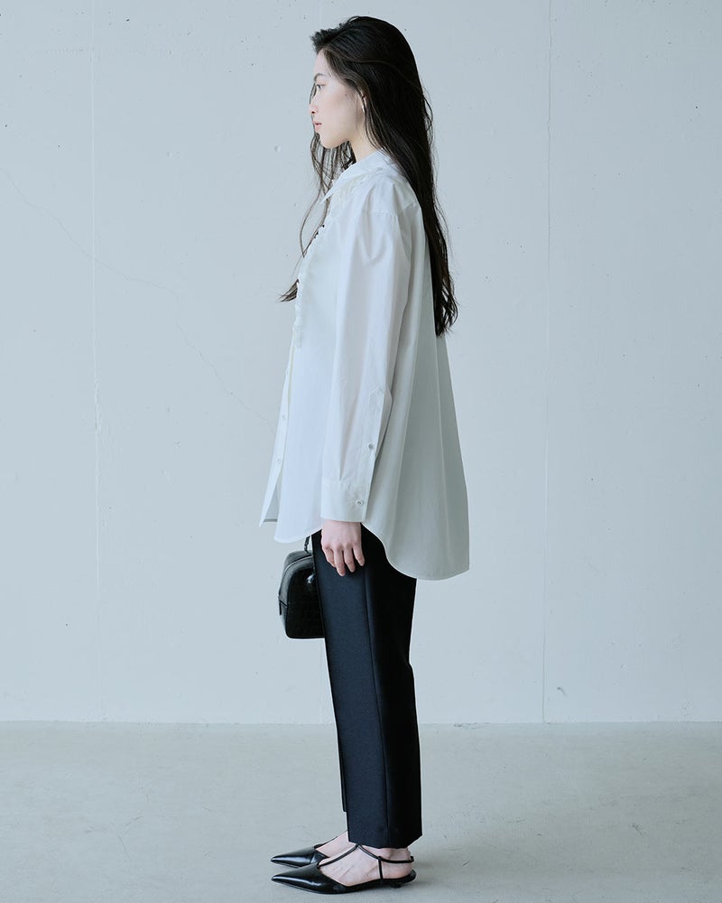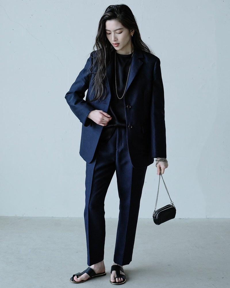 細いパンツは自信がなくて、という方にこそトライしてほしい、シルエットとはき心地のよさ。トワルに1本1本ピンを打ちながら作り上げる、立体裁断のテーパードパンツ。シルキーな光沢をたたえたダブルフェイス素材を用い、センタープレスを入れ、端正な表情に。いつもより腰の位置が高く見えるうえ、動きやすいのを実感できるはず。同素材のジャケット(14773)とのセットアップもおすすめ。