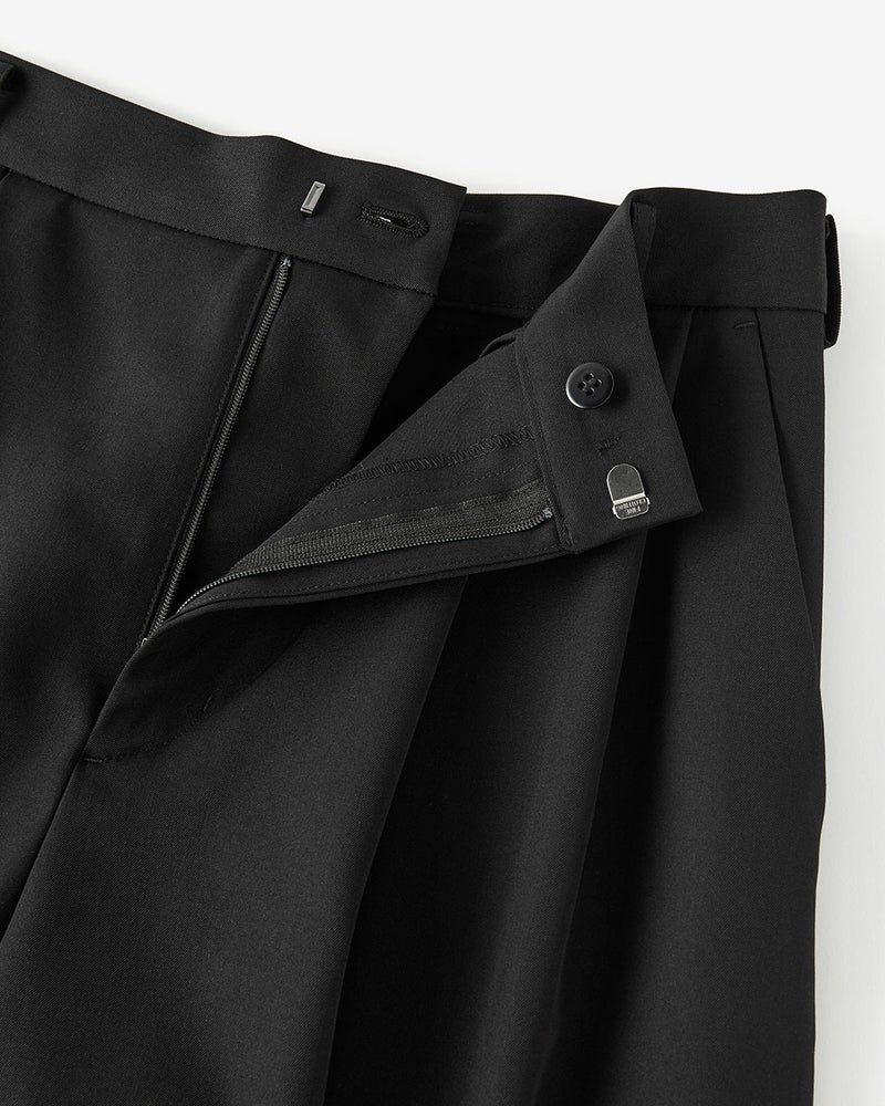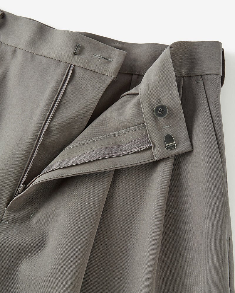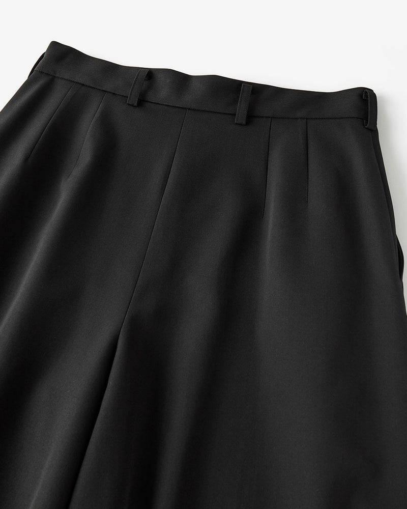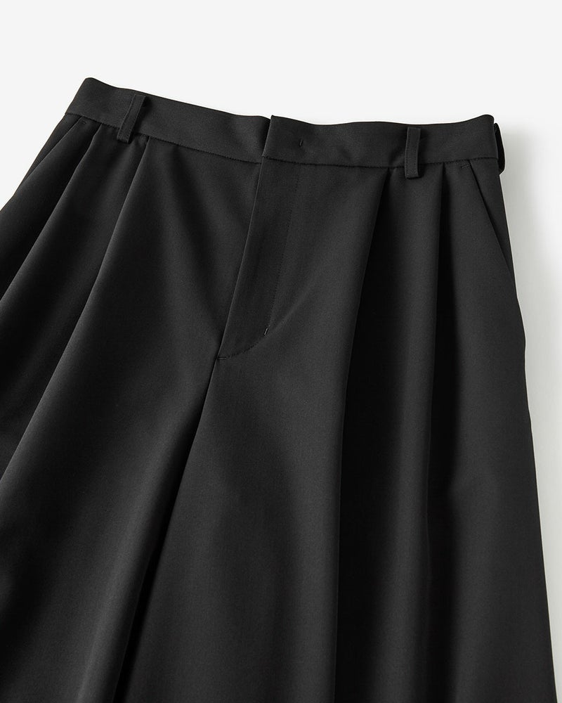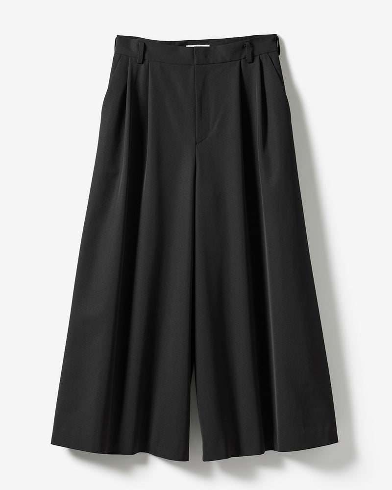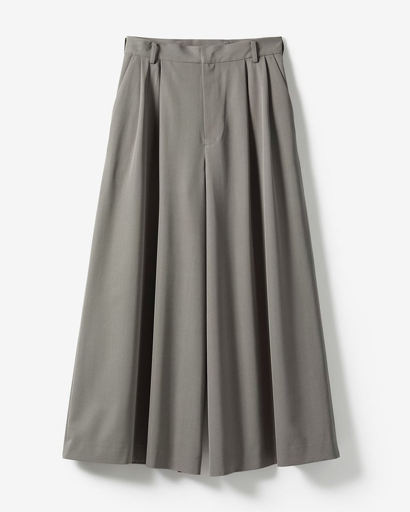 裾まわりのボリュームをたっぷりとったロングキュロットは、ワイドパンツともスカートとも一線を画すシルエット。ラグジュアリーなのに、きびきびと動ける着用感が魅力。ツータックを入れ、ウエストはすっきりとスマートに見える仕上がりに。サマーウールの風合いを生かしながら、ドライタッチに仕上げたツイル素材を使用。ツヤやドレープが美しく映えるうえ、軽やかでさらりとした着心地。