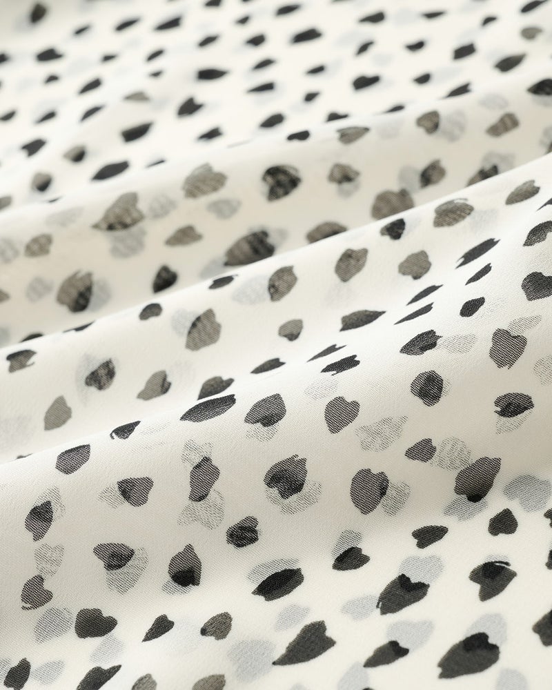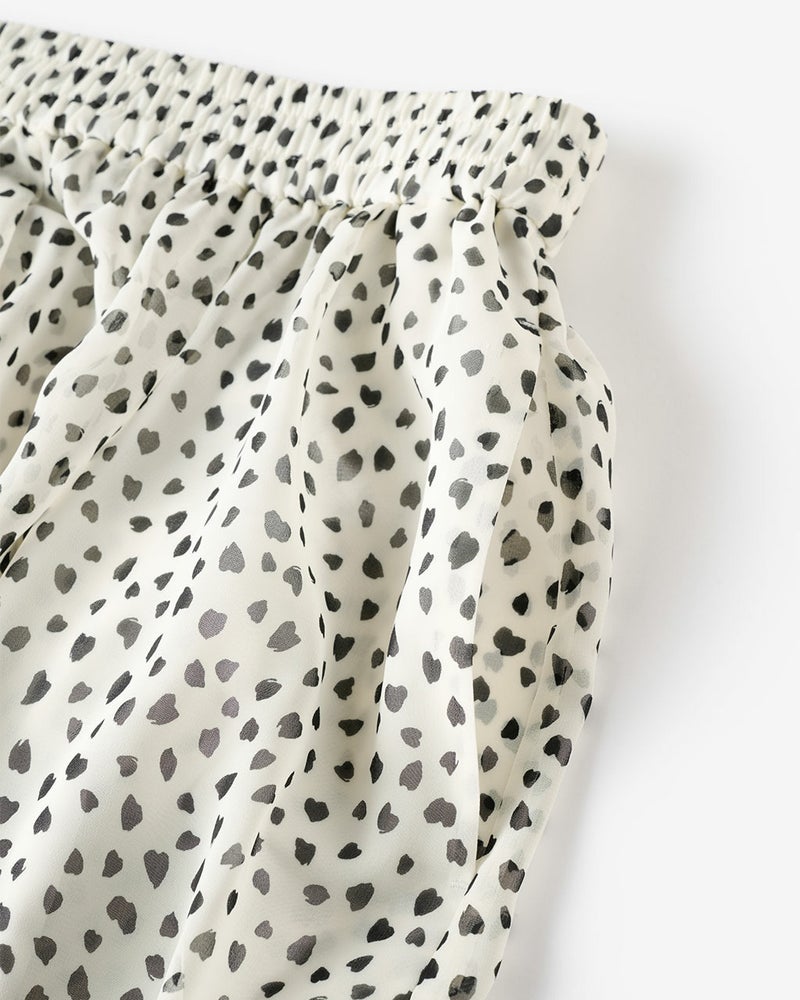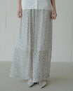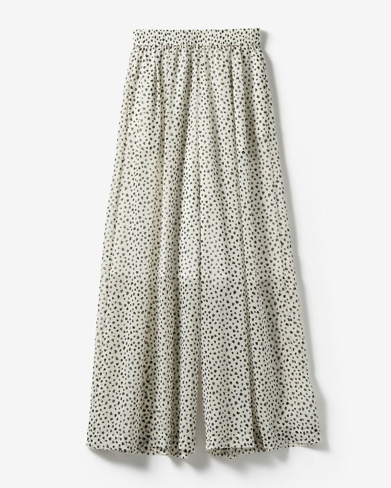 シンプルなデザインのワイドパンツは、ウエストゴムでリラックスできるはき心地。ふわりと軽いシフォンジョーゼットを用いて、透け感と落ち感が美しく出るよう設計。プリントは京都の工場で行い、繊細かつシックな印象に。同じ素材のブラウス(品番:14811 シフォンジョーゼット・スタンドフリルブラウス)との組み合わせで、オールインワンのようなエレガントなセットアップが完成。シアーでも安心なペチコート付き。