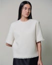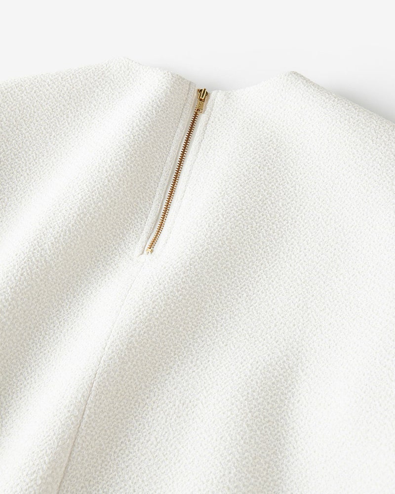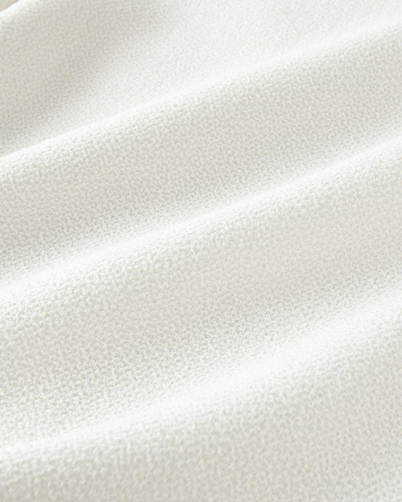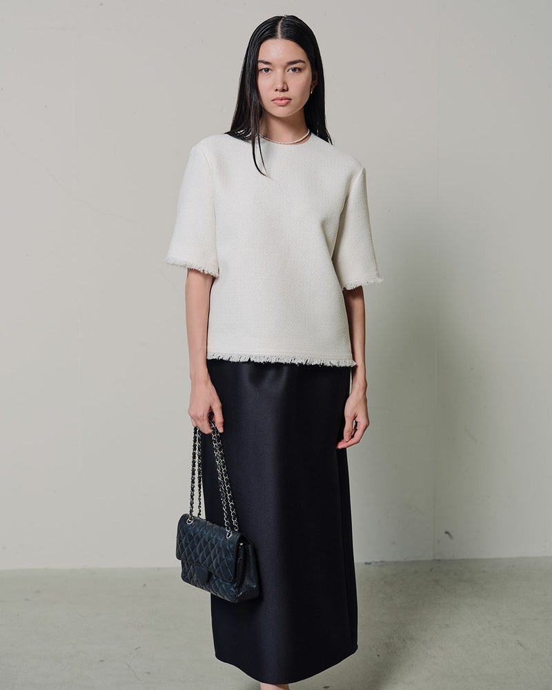 すべての無駄をそぎ落としたミニマルなフォルム。それでいて、着るとどこか女らしさが漂うツイードブラウス。ベースにコットンを使用したツイードには、アクセントとしてリング糸を織り込み、ふっくらとした立体感とニュアンスをプラス。肌なじみがよく、ほどよく通気性のあるやさしい着心地。