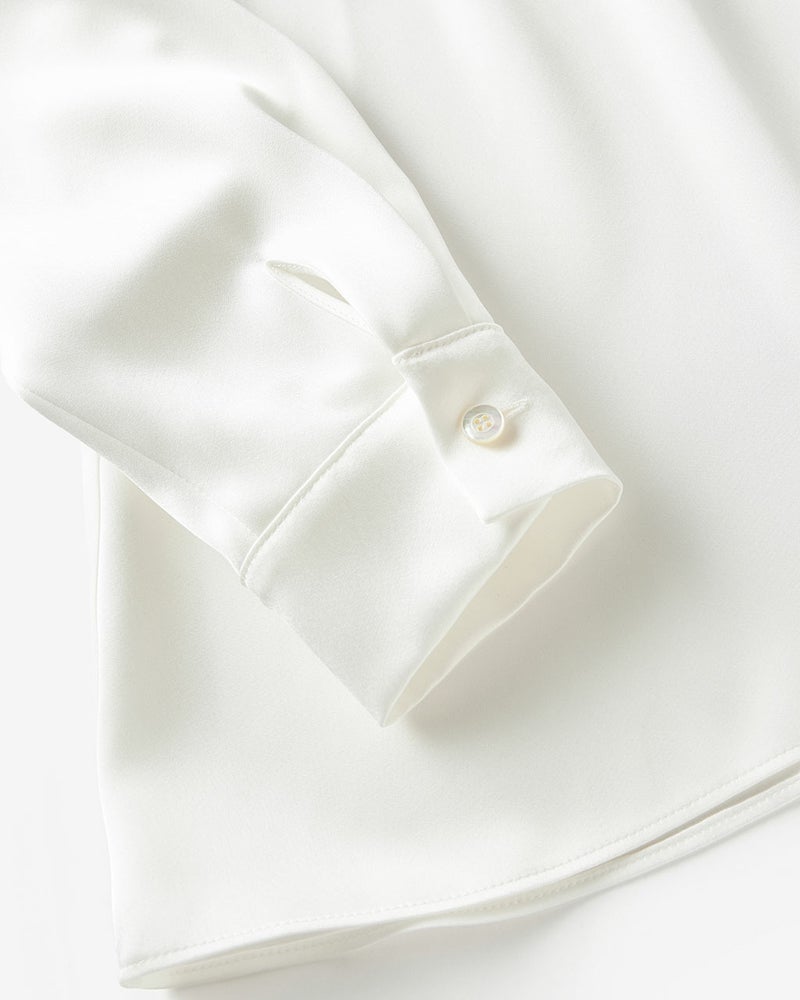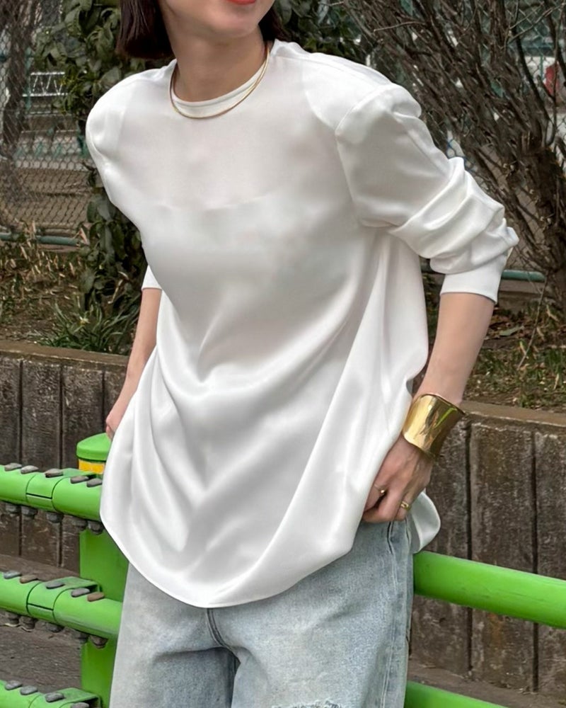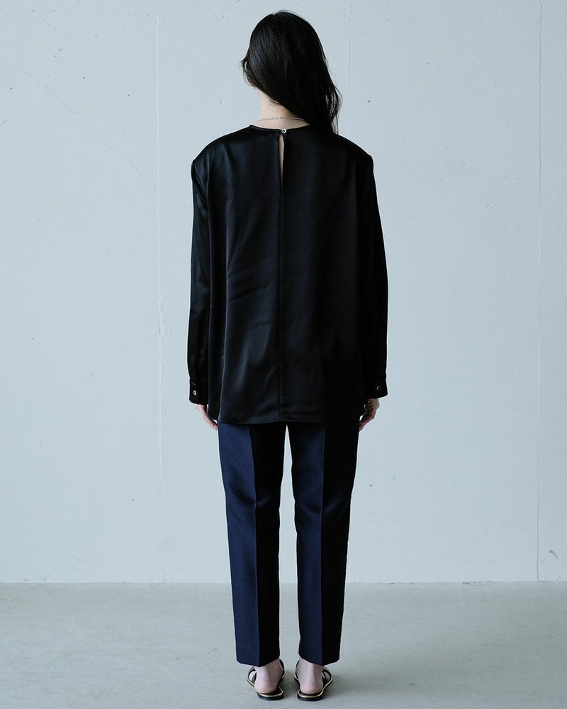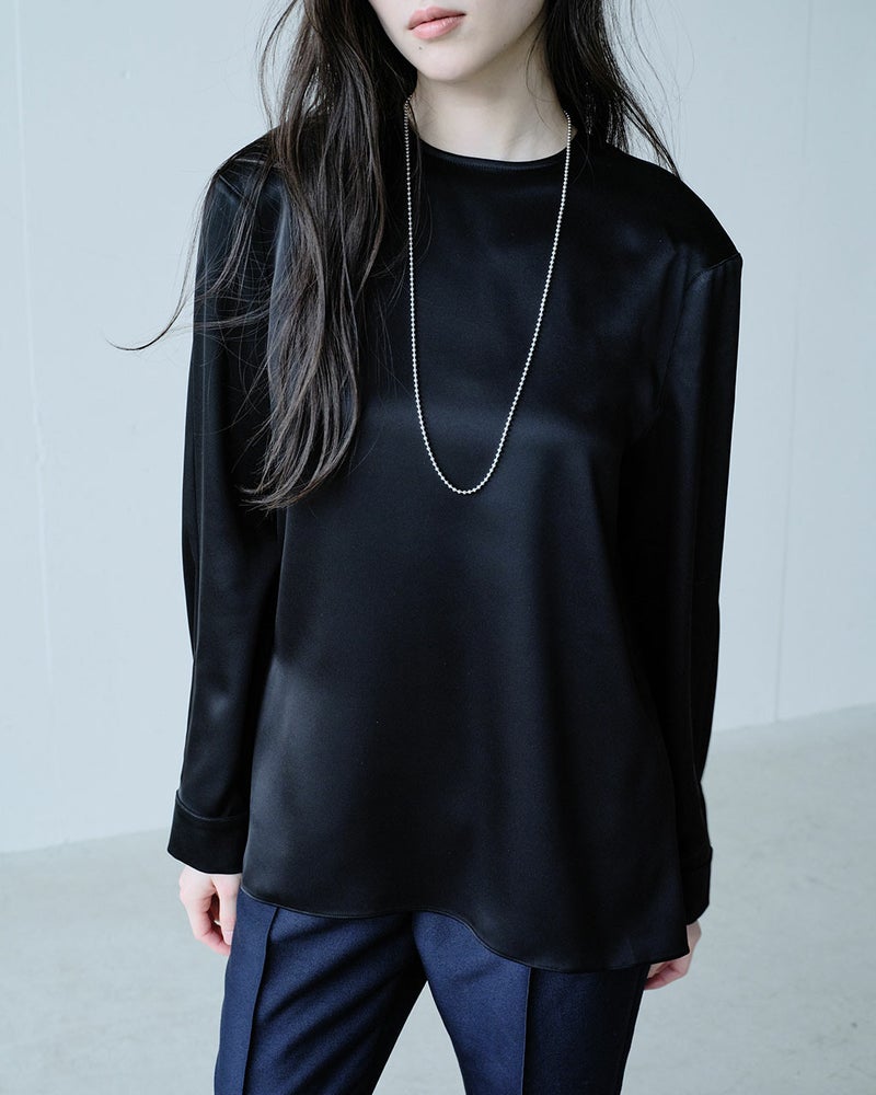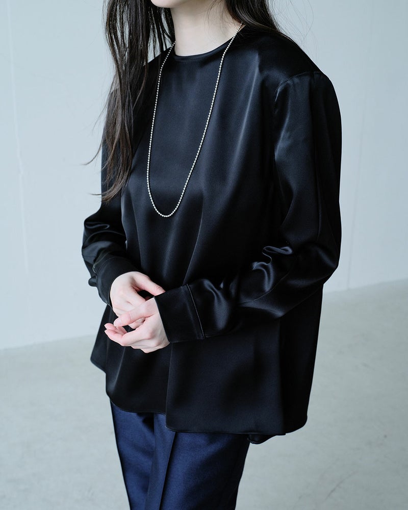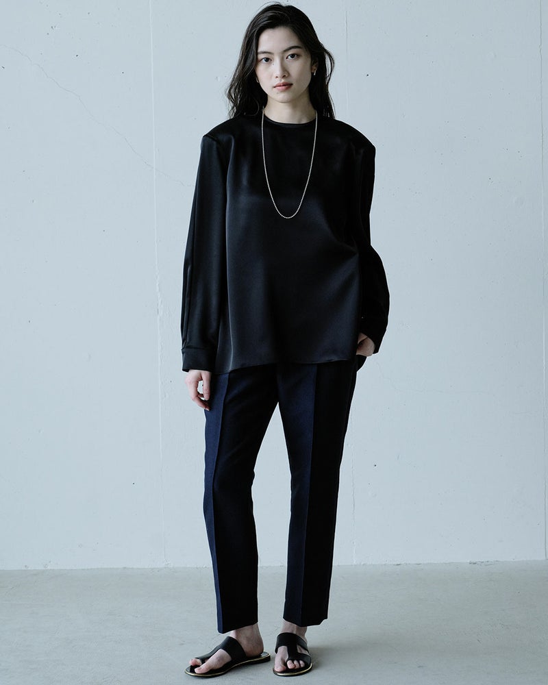 注目のパワーショルダーを取り入れるなら、あえてTシャツ感覚でさらりと着こなせる、こんなブラウスがおすすめ。袖を通しただけで構築的なシルエットになるうえ、着心地は快適そのもの。シルクのような光沢をもつダブルサテン素材だから、これ1枚で上品な印象に。