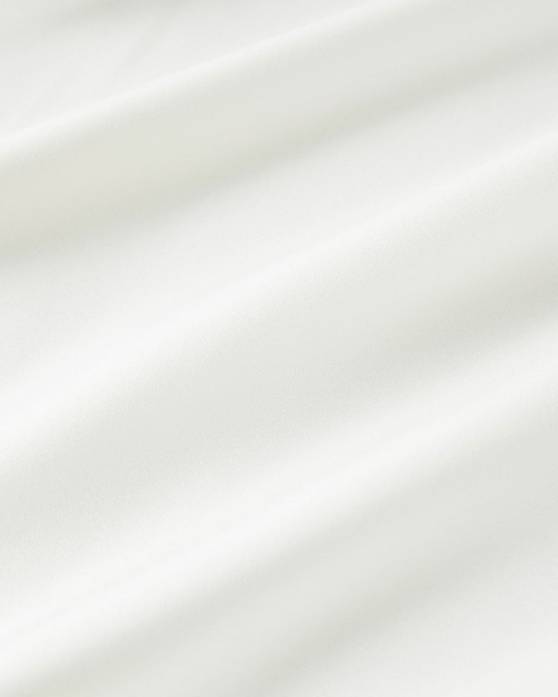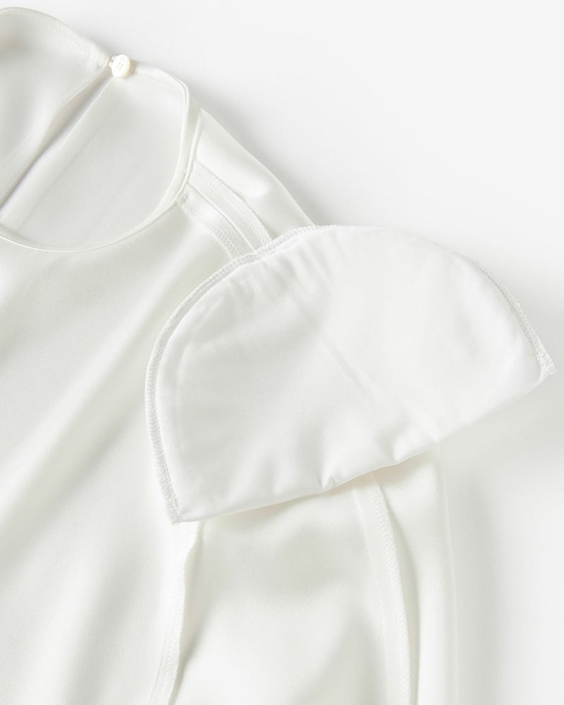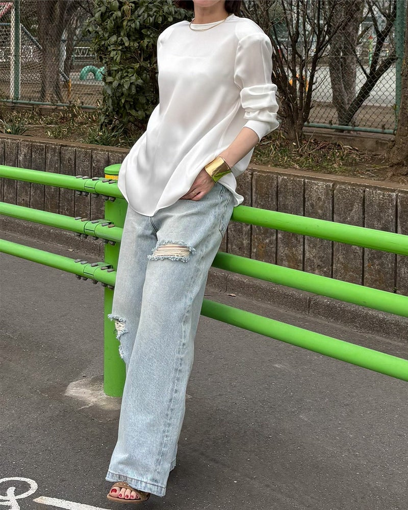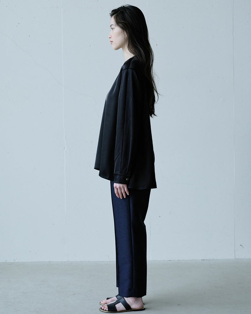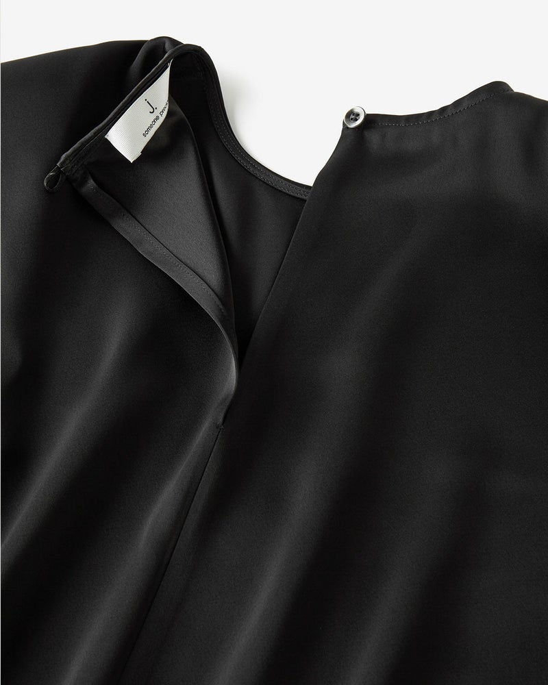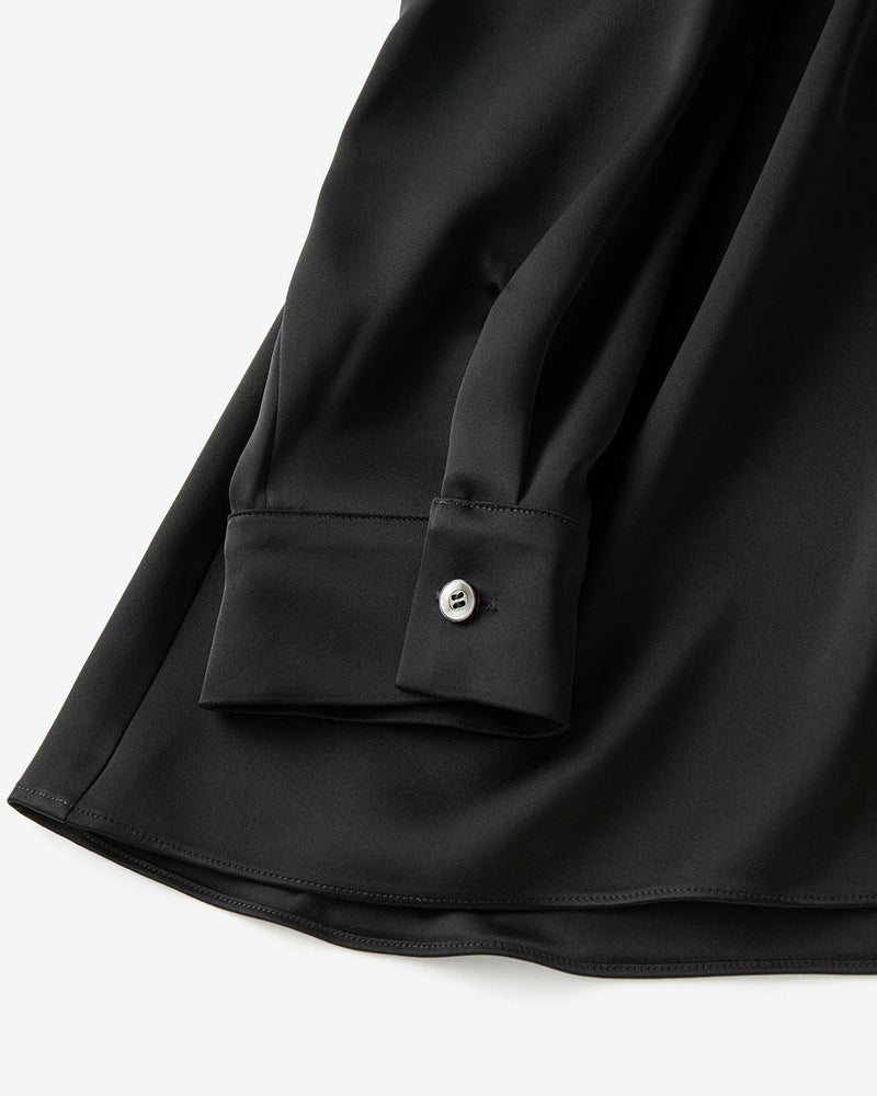 注目のパワーショルダーを取り入れるなら、あえてTシャツ感覚でさらりと着こなせる、こんなブラウスがおすすめ。袖を通しただけで構築的なシルエットになるうえ、着心地は快適そのもの。シルクのような光沢をもつダブルサテン素材だから、これ1枚で上品な印象に。