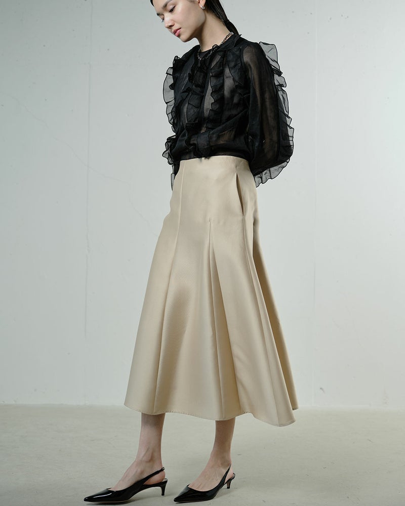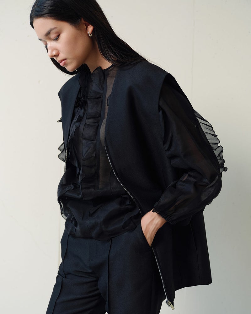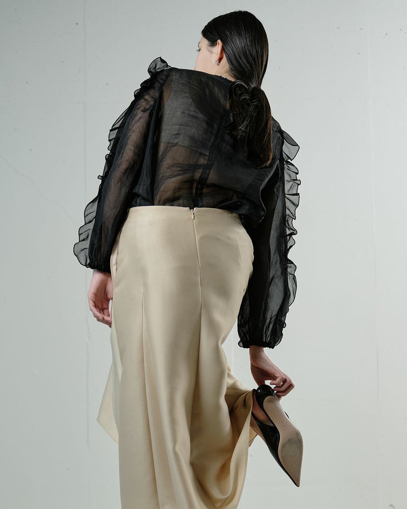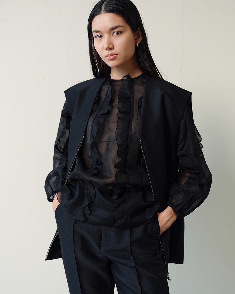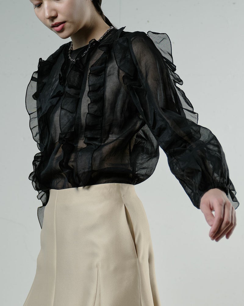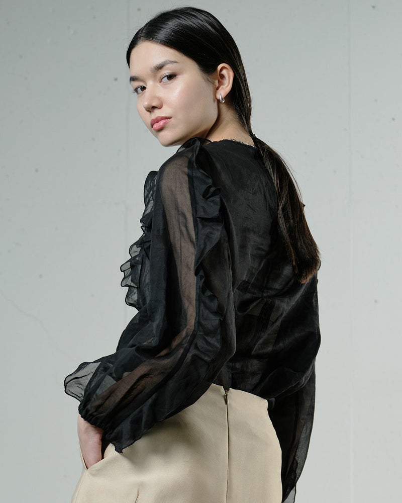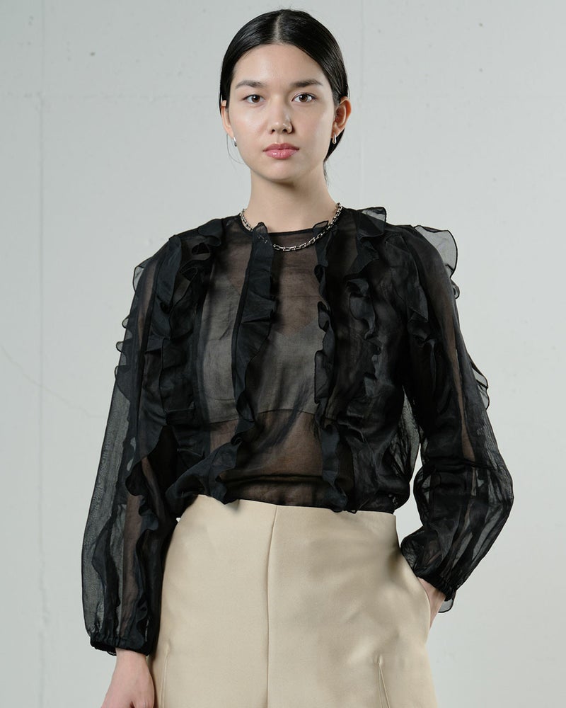 光に透ける軽やかなコットンオーガンジーのブラウス。100番双糸と呼ばれる細番手の綿を、ガスバーナーの炎をくぐらせて余分な毛羽を焼き、強撚糸にして織り上げました。最高級のシャツ生地にも用いられるほどの、贅沢な素材。ダイナミックなフリル仕立てにすることで、コットンの凛々しさはそのままに、甘く華やいだシルエットに。
