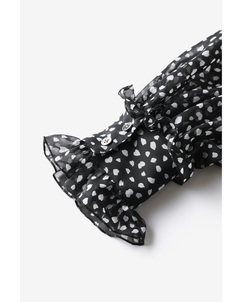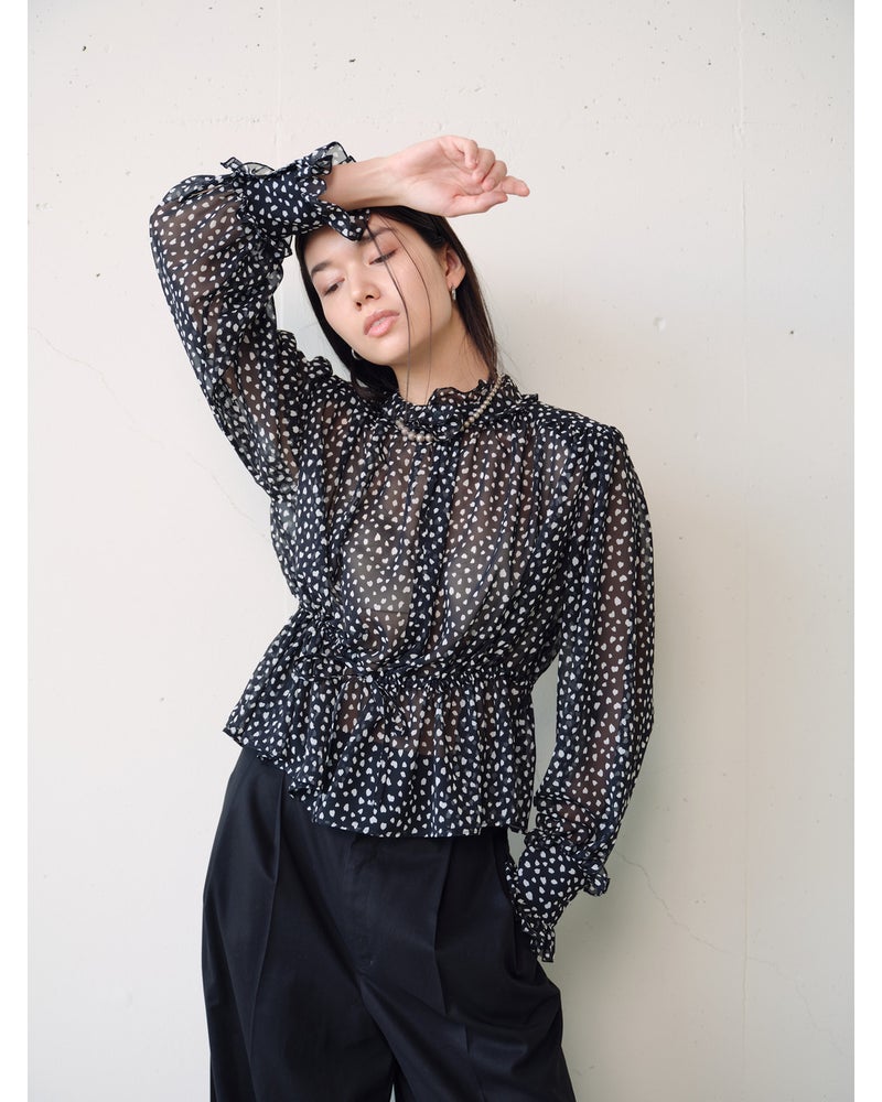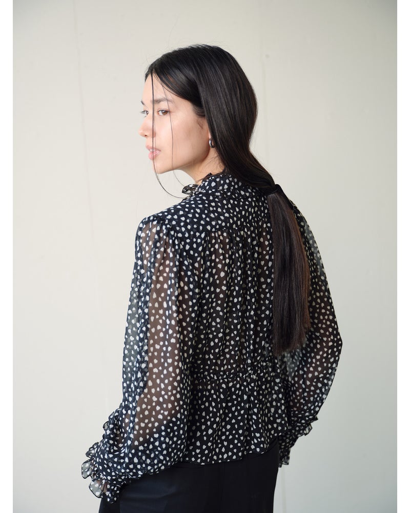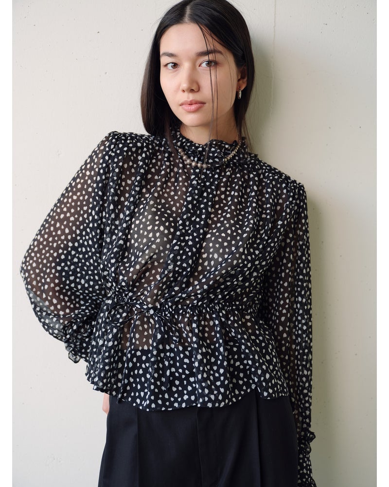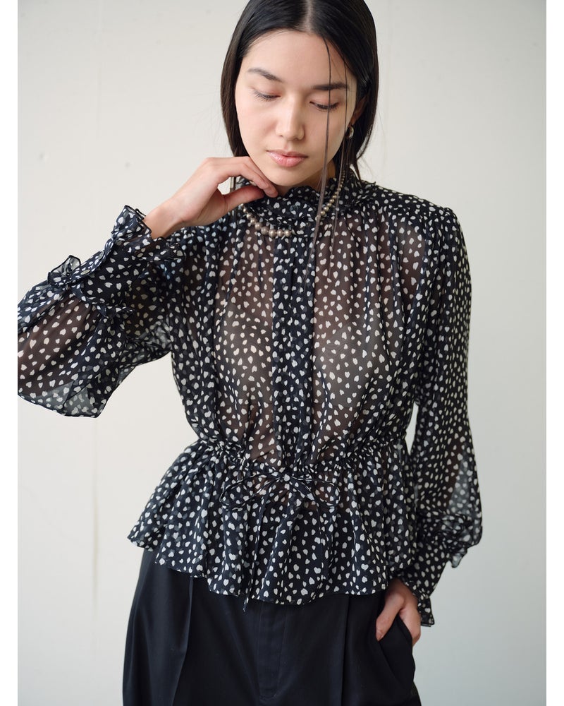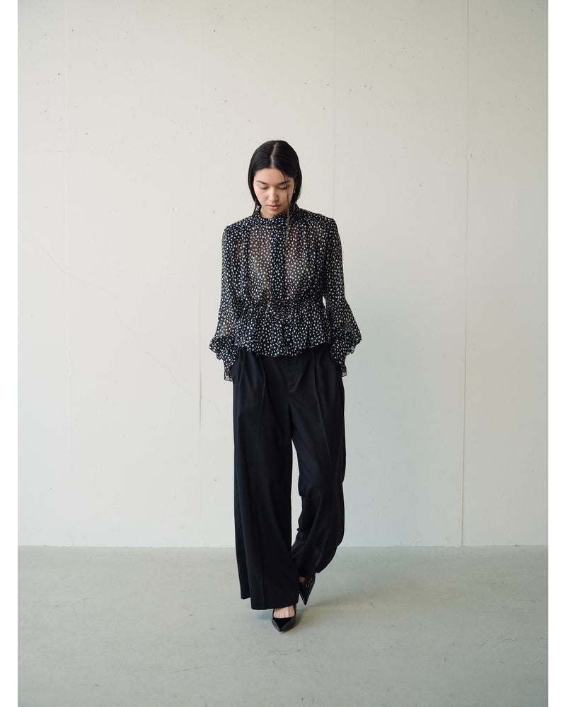 シフォンの透け感とたっぷりとしたギャザーが、フェミニンな甘さを醸し出すブラウス。衿と袖口にはフリルをあしらい、ウエストにはリボンを通すことで、シルエットのアレンジも可能。素材に選んだのは、重さを極力抑えた加工で、柔らかな風合いに仕上げたシフォンジョーゼット。京都の染色工場でプリントしたドット柄が繊細かつシックな印象。同素材のワイドパンツ(品番:14797 シフォンジョーゼット・ワイドパンツ)とのセットアップなら、より女らしくエレガントなコーディネートに。