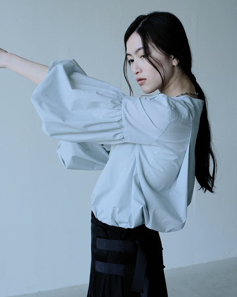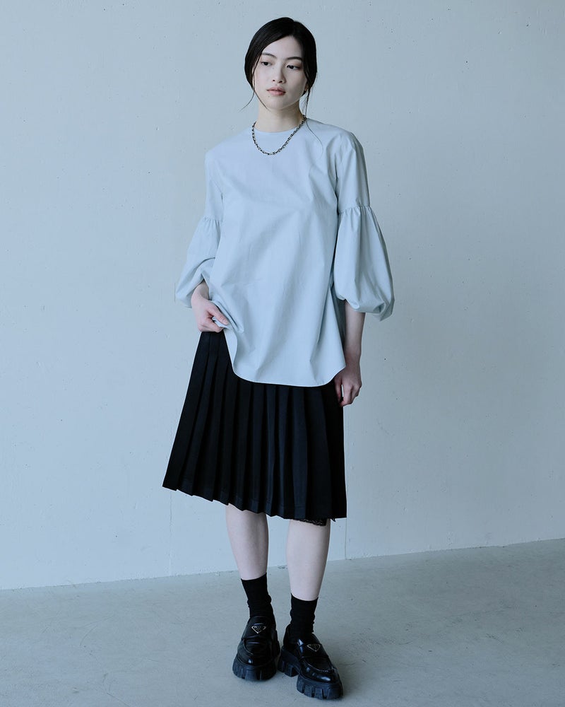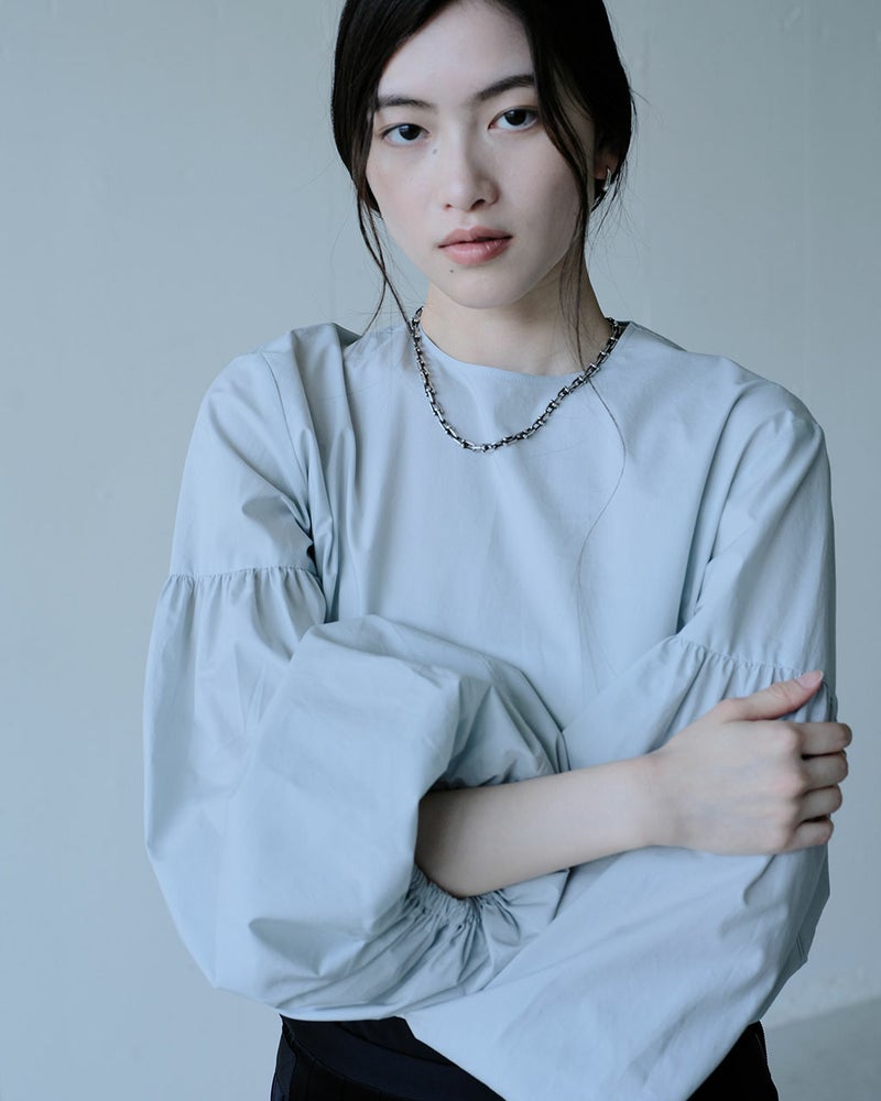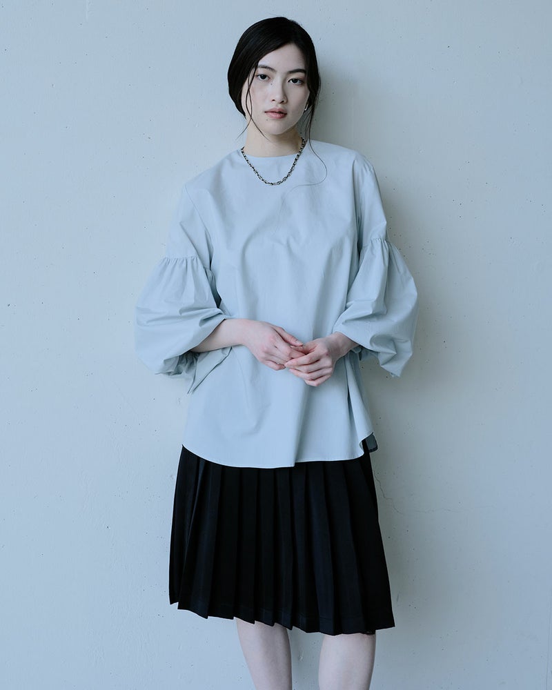 年齢やスタイルを超えて、女性の魅力を引き出すパフスリーブのシンプルシックなブラウス。袖をふんわりとしたシルエットにしたぶん、衿まわりは開き過ぎないクルーネックに仕上げることで、着たときの上品さが際立つ印象に。ごく細いコットン糸を高密度に織り上げたタイプライター生地は、ほどよいハリと肉感があり、どんなシーンでも凛とした存在感。しかも爽快感のある快適な着心地。
