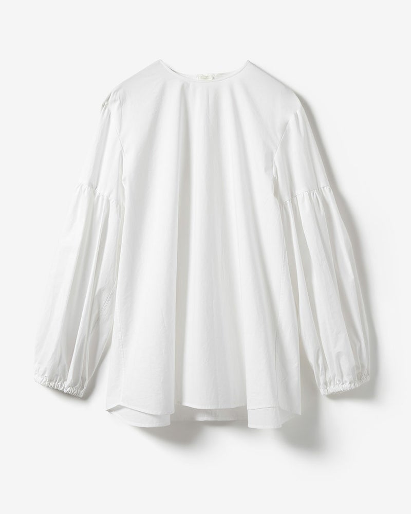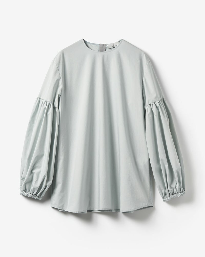 年齢やスタイルを超えて、女性の魅力を引き出すパフスリーブのシンプルシックなブラウス。袖をふんわりとしたシルエットにしたぶん、衿まわりは開き過ぎないクルーネックに仕上げることで、着たときの上品さが際立つ印象に。ごく細いコットン糸を高密度に織り上げたタイプライター生地は、ほどよいハリと肉感があり、どんなシーンでも凛とした存在感。しかも爽快感のある快適な着心地。