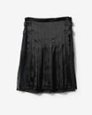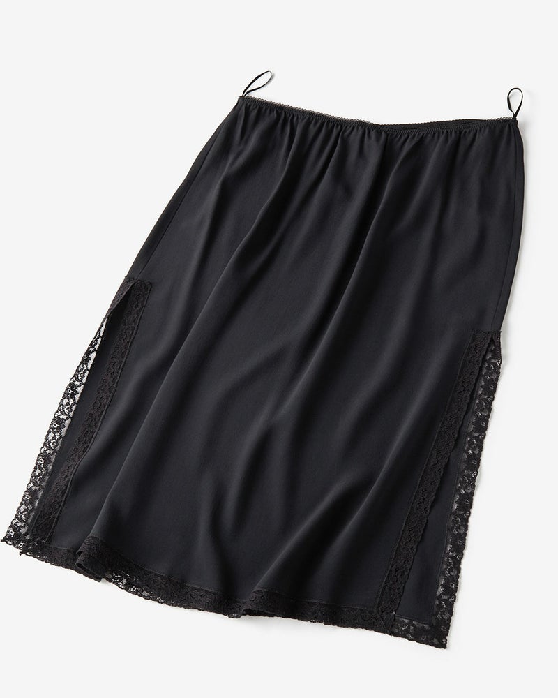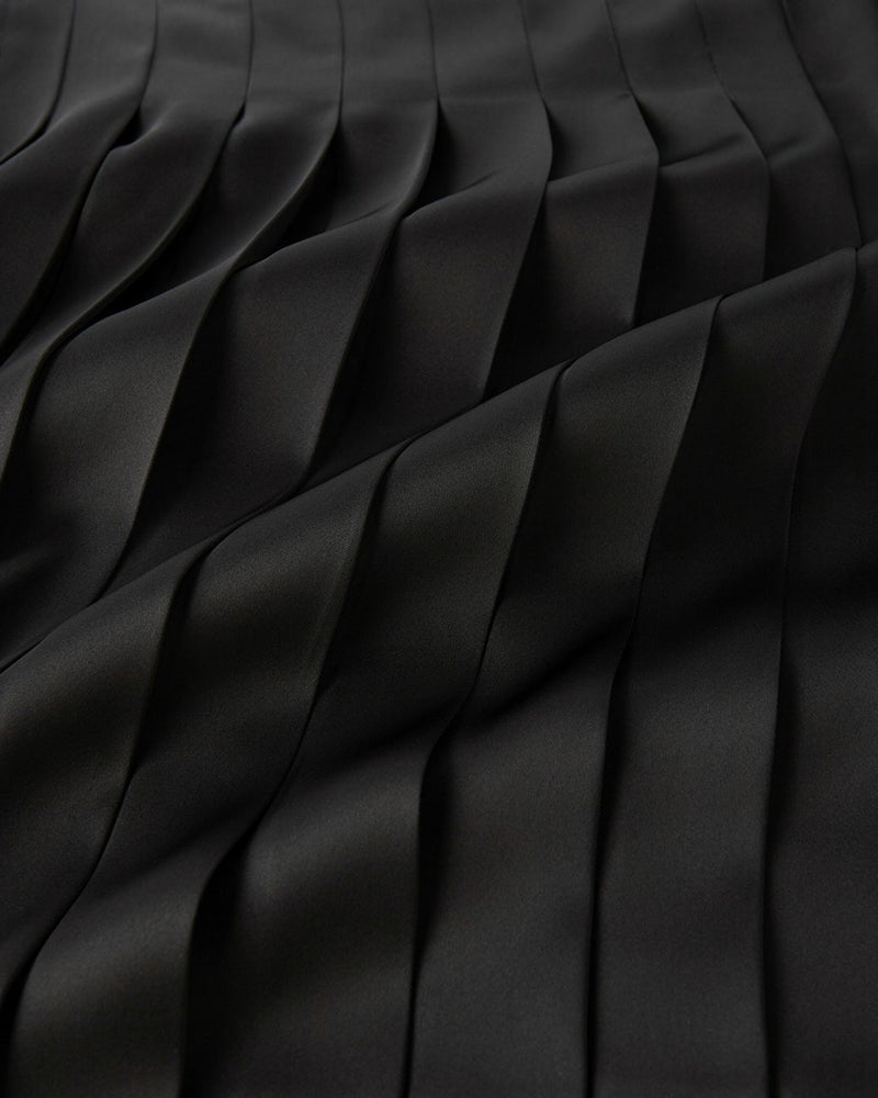 ややローライズな仕立てで、腰ばきがサマになるプリーツスカート。両サイドが開いたデザインだから、レギンスやパンツの上に重ねてはくことで、旬のスタイルが完成。サイドのベルトもあいまって、モードな空気感に。素材に選んだのは、ブラックのツヤが美しいダブルサテン。二重織りならではのふくらみを最大限生かせるよう、ヨコ糸に太番手の糸を使用し、しっかりとしたハリ感を実現。個性際立つデザインに、エレガントな品のよさをプラス。