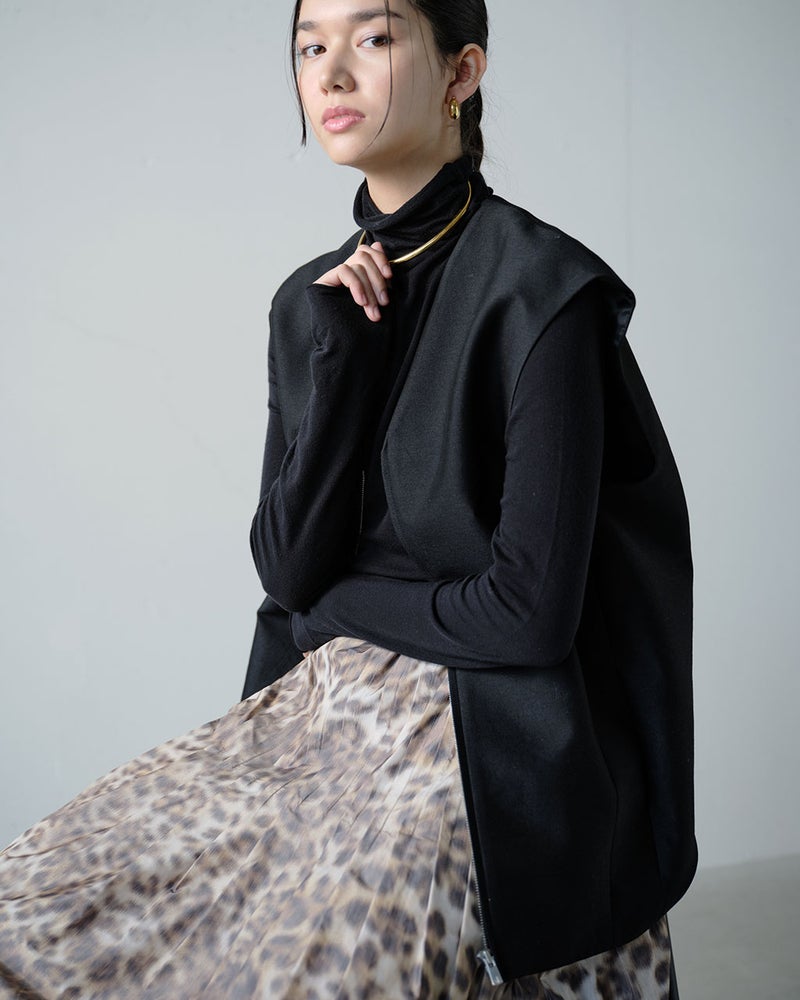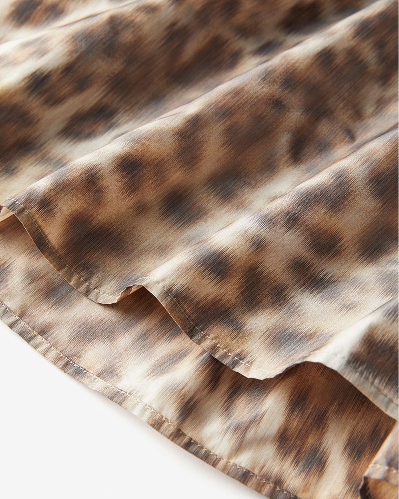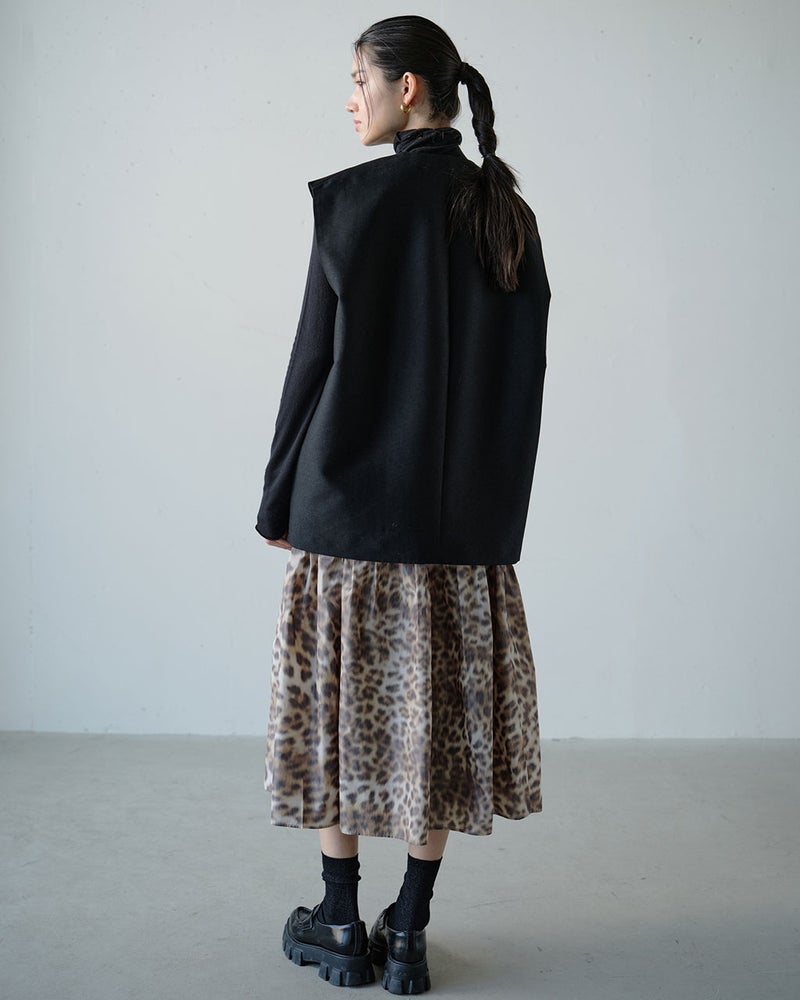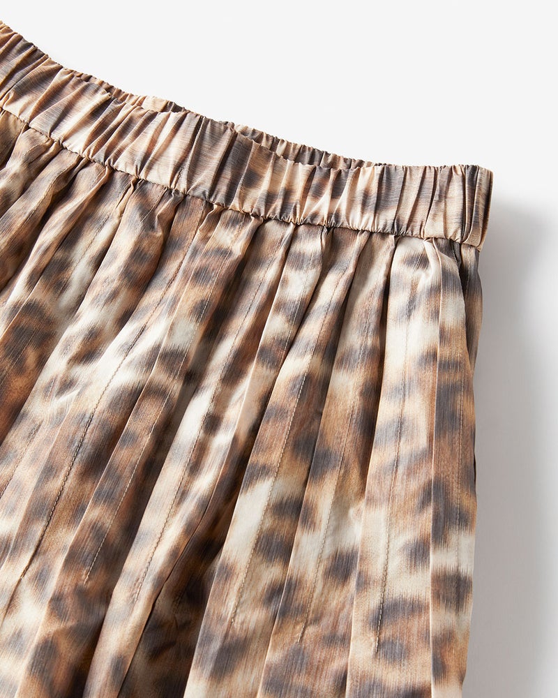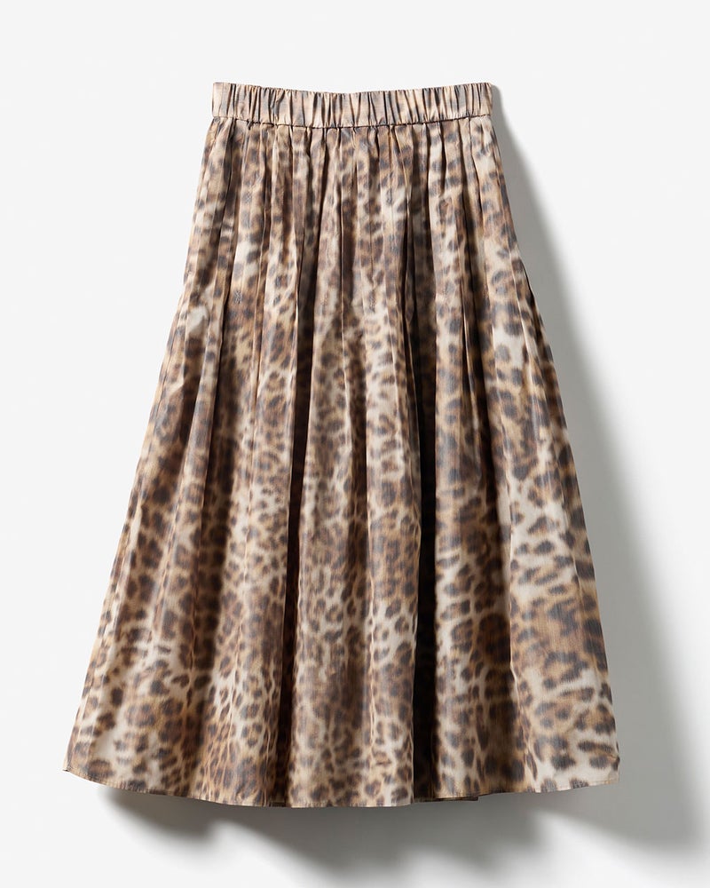 足首のいちばん細いところだけを見せる、絶妙丈のフレアスカート。素材に選んだのは、イタリア・COMO社によるタフタ生地。ジャカード織機のたて糸だけにプリントしながらよこ糸を織り込んでいく、ほぐしプリントの手法を用いているため、にじんだようなレオパード柄が上品な印象。タフタ特有のハリ感とカッティング技術により、モードなシルエットが完成。