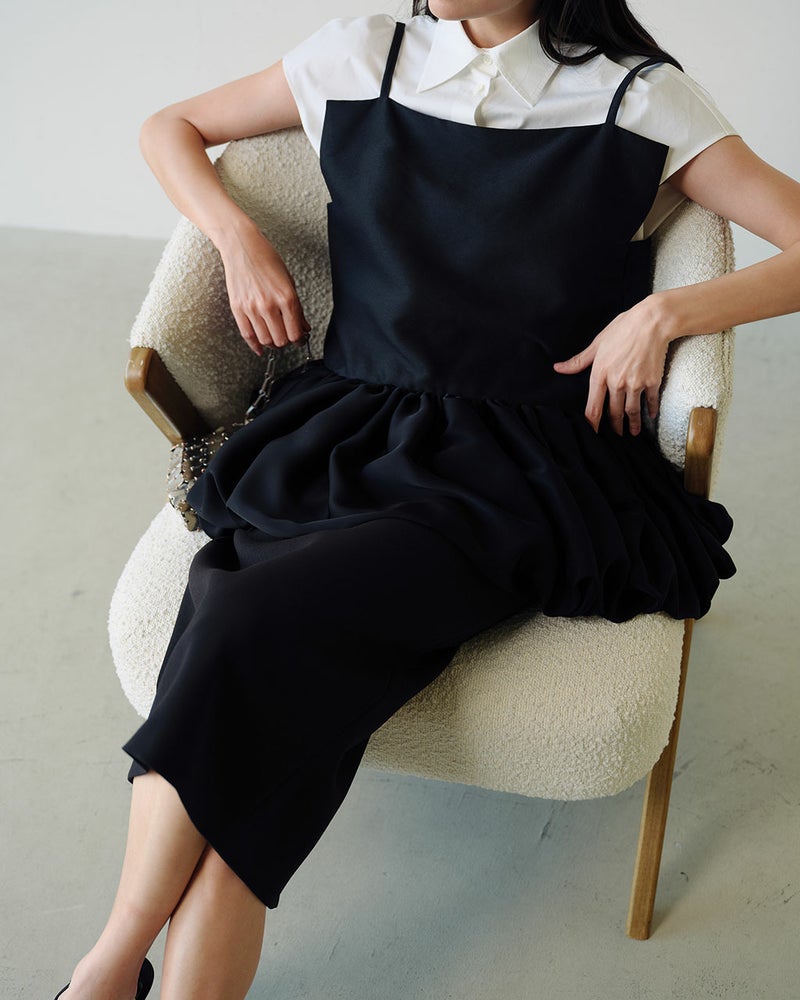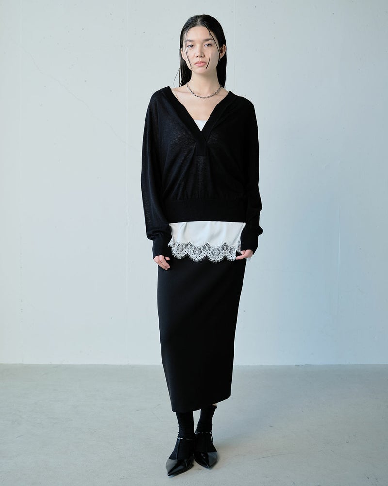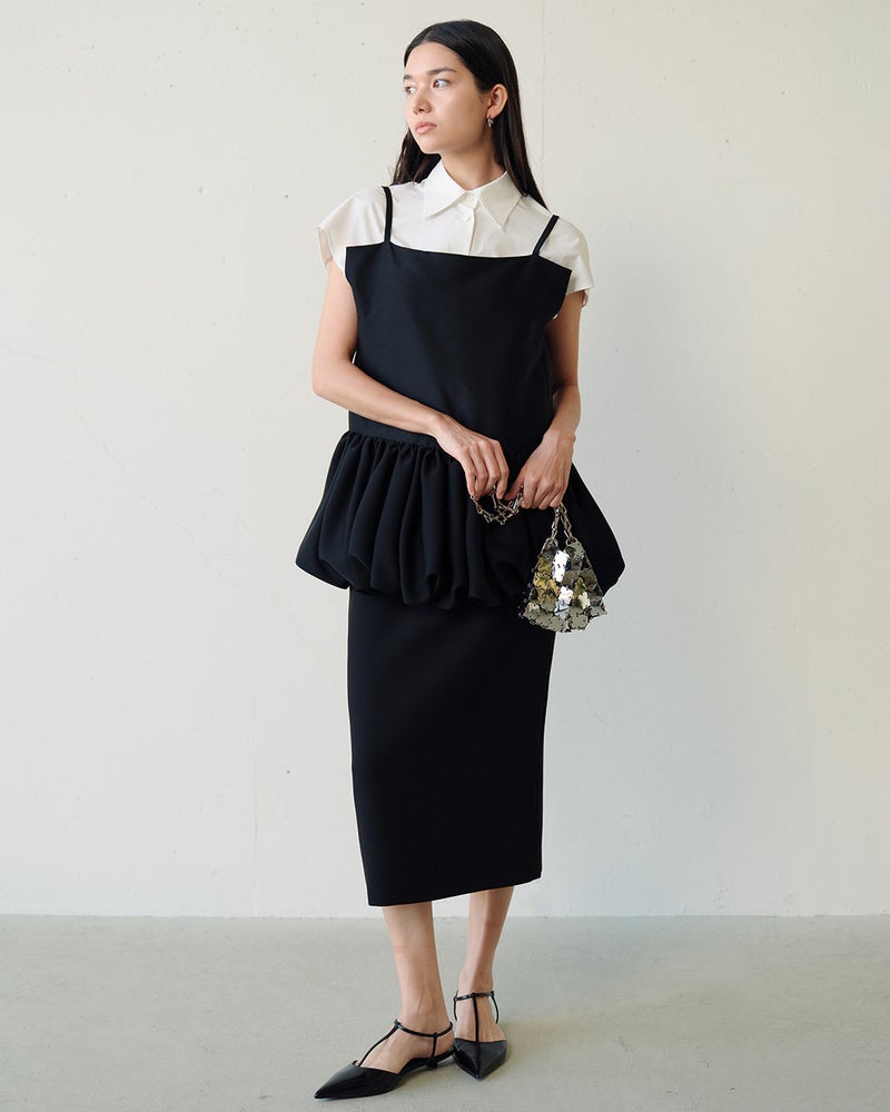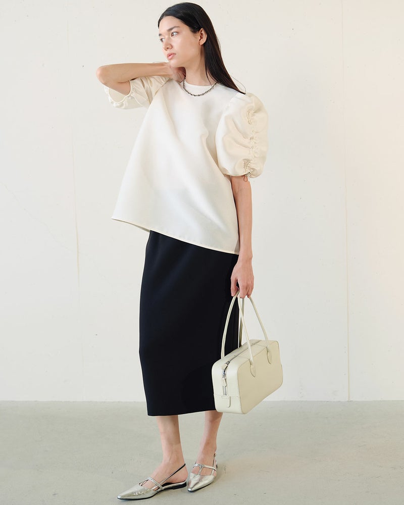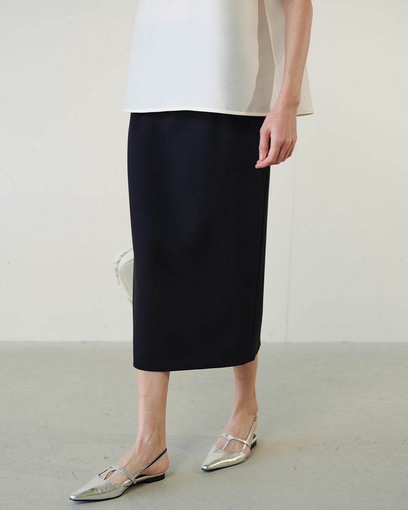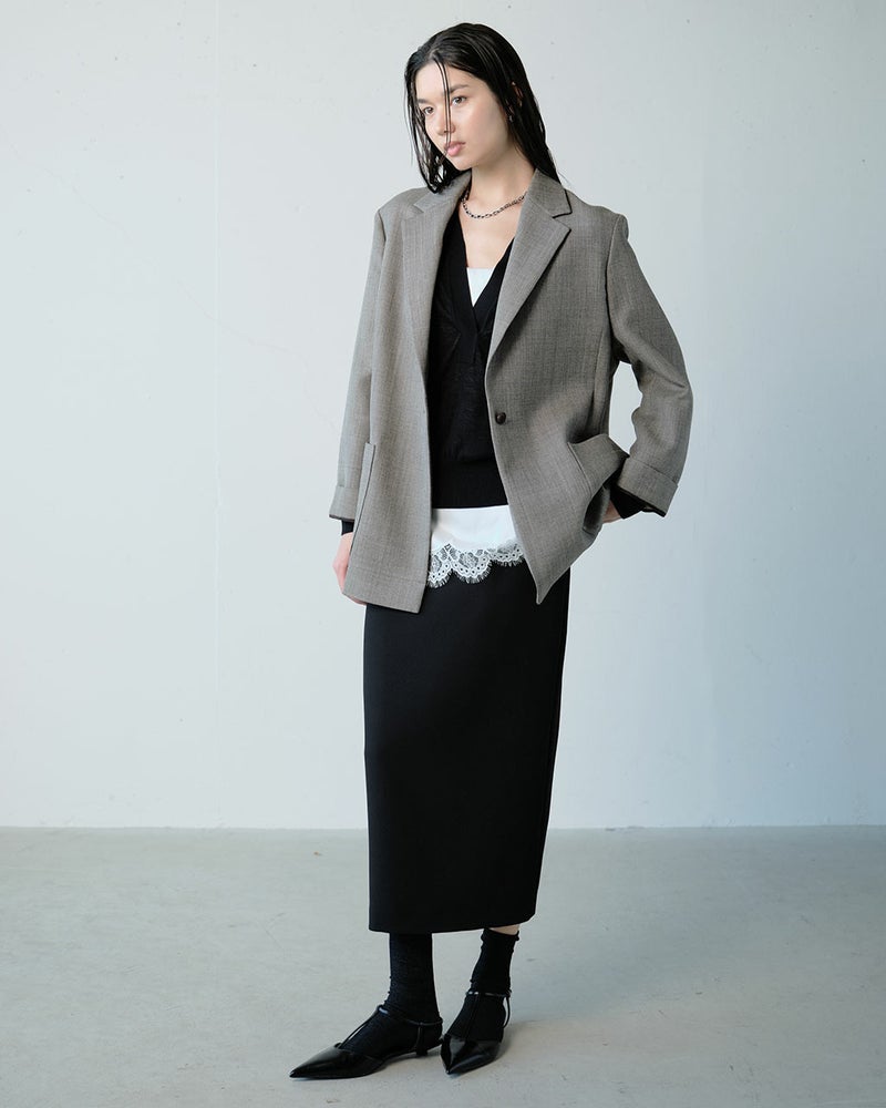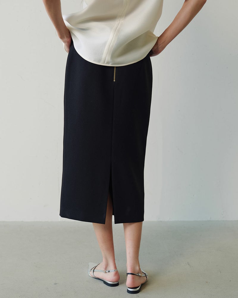 シンプルであればあるほど、仕立ての美しさがひき立つ。j.(ジェイドット)の立体裁断の技が息づくタイトスカート。細身なのに窮屈さがほとんどなく、動くほどにボディラインをスタイリッシュに見せるシルエット。ウエスト部分にはゴムを忍ばせ、思いのほかラクな着心地を実現。アセテートとポリエステルの合撚糸を二重織りにしたダブルジョーゼットで、どんな場面でもエレガントなテイストに。