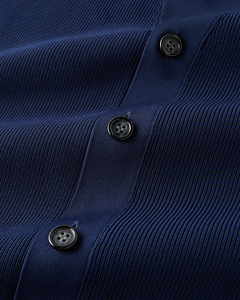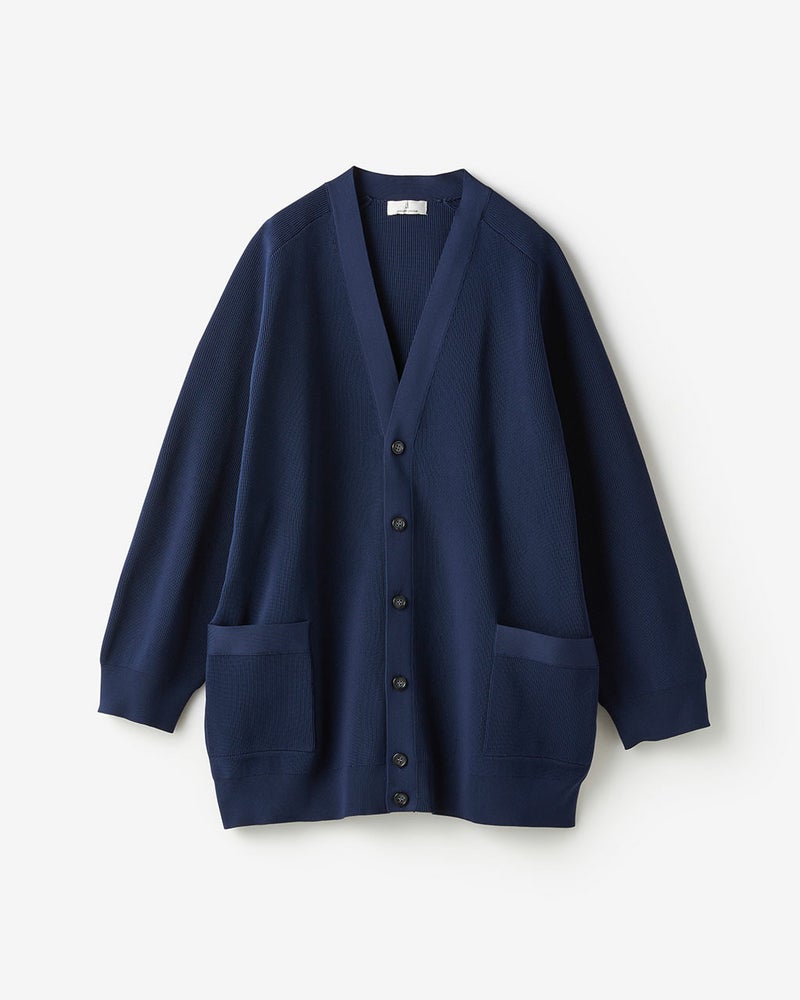 シンプルなVネック、ゆったりとしたサイズ感のカーディガン。特殊加工によりストレッチ性とハリ感を高めた糸は、軽量でしなやかな着心地。染色時にソフト加工を施し、柔らかな手触りに仕上げました。肩の後ろの切り替えや前ポケットの位置、Vの開き具合など、細部まで計算されたデザインが、構築的な美しさを実現。