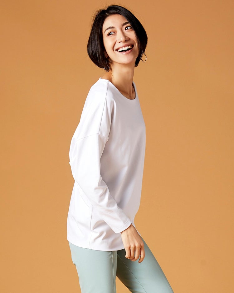 - 体型は165センチ50キロ 肩幅広め、腕長、下半身重心太もも外張り、膝下太め 腕が長いので、ネットで長袖を注文するのが怖かったけど、挑戦。腕は長さギリギリ許容範囲かな。欲を言えばあと3センチくらい欲しかった。見頃は余裕がある感じ。すっきり目のドルマンスリーブ。さすがの白さ。