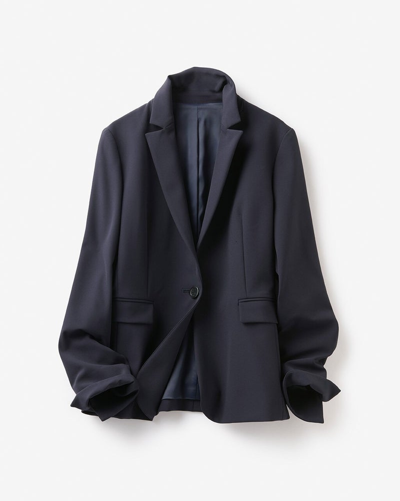 ほのかな光沢感を持つ美素材にストレッチ性をプラスしたリラックスツイル素材。細身の衿が上品で、通勤や行事など品格が求められる場にもぴったり。ボディラインを美しく見せる立体裁断で、洗練された見た目を実現しています。どんなときも世界は回り、社会は動くから。がんばる女性に贈るストレスフリーなジャケットです。