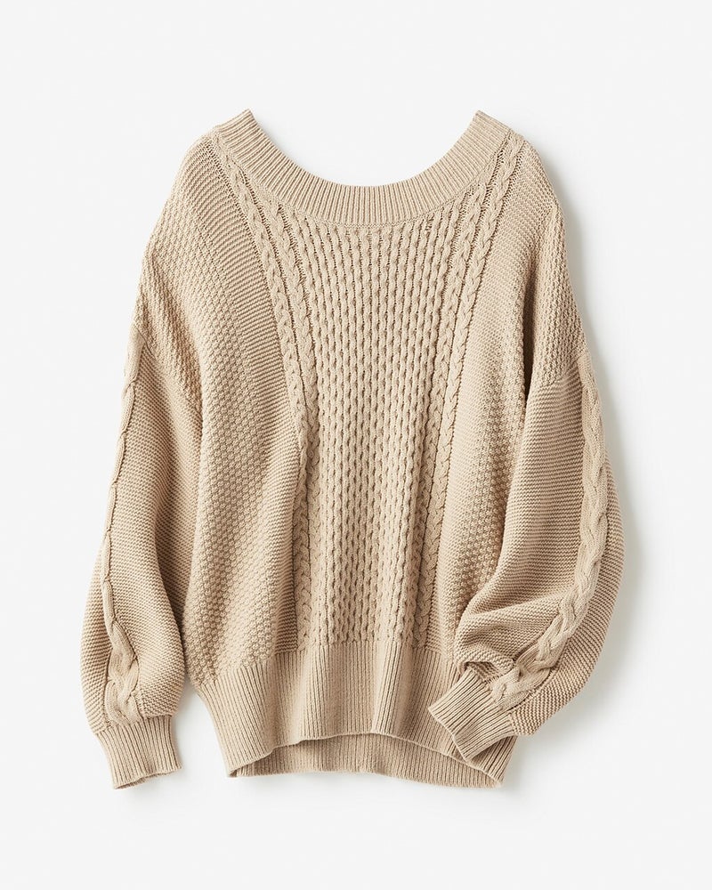 ガーター、鹿の子、ケーブルと編地の変化が楽しめるコットンナイロンのニット。前はシンプルなボートネック、後ろは飾りボタンのデザインでバックスタイルも美しく。ふわっとした袖口も大人の可愛さをプラス。