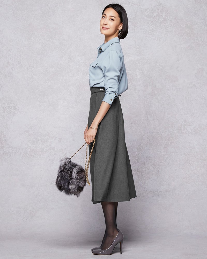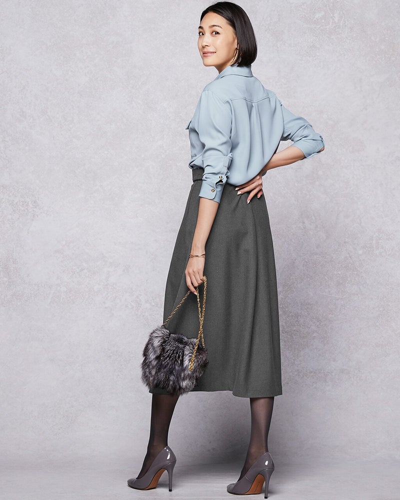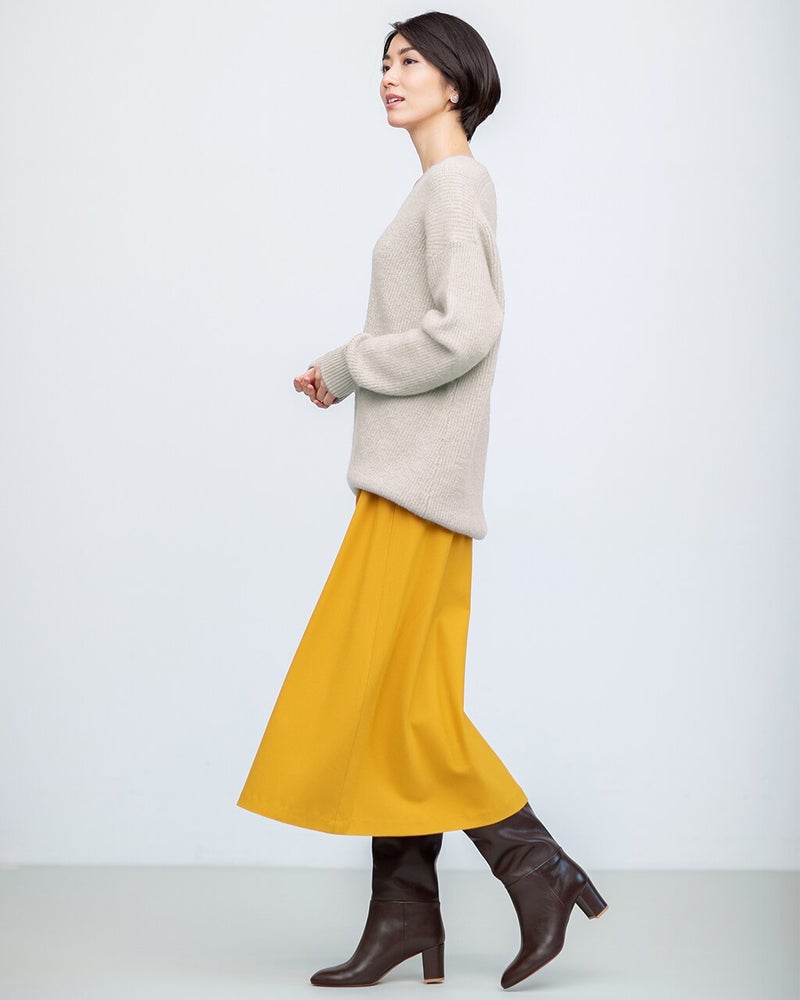 レディな丈感のフレアスカートは、動きに揺れて立居振舞までエレガントに。ウールのように見えて吸湿発熱する生地と、裏起毛で暖かさも抜群。