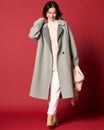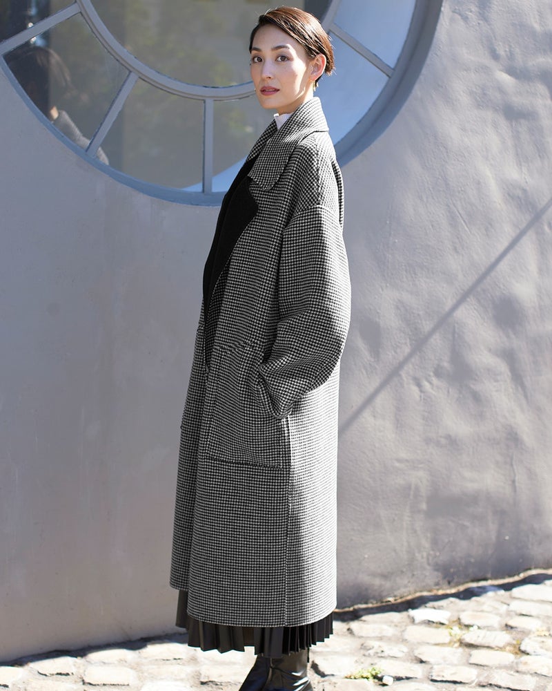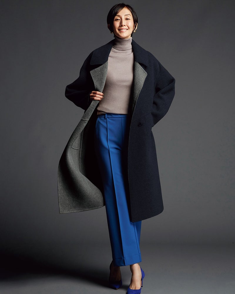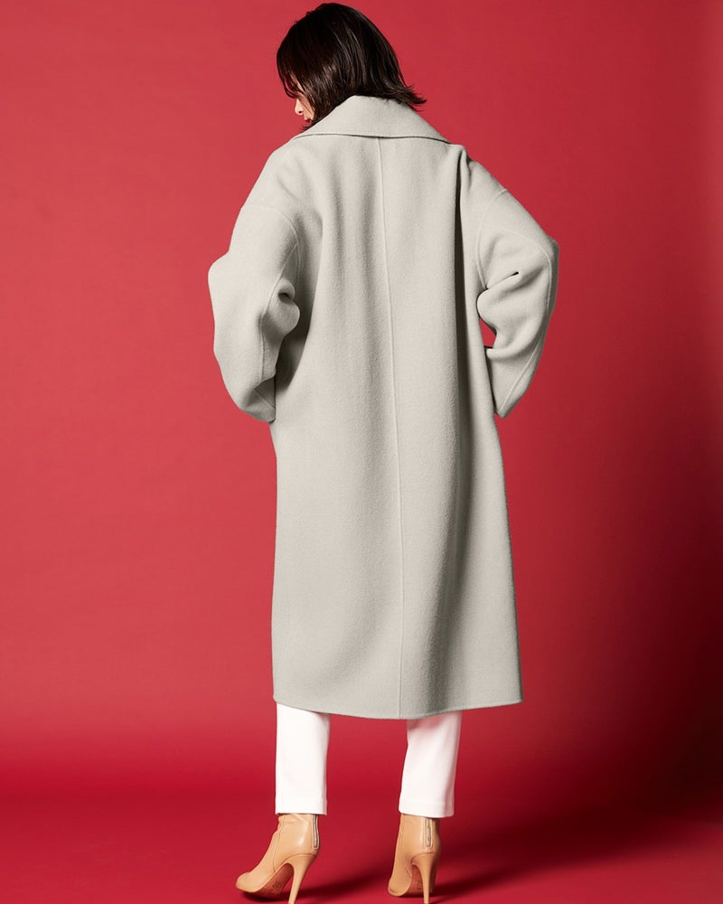 POINT2.品格素材をモダンに着こなすデザイントレンドのゆったりとしたシルエット、裏面のウール配色、どんなスタイルにも似合う膝丈など、通勤、お出かけどちらにも使える上品なスタイルに仕上げました。ふわっと軽くなめらかな着心地、ぜひご体感ください。