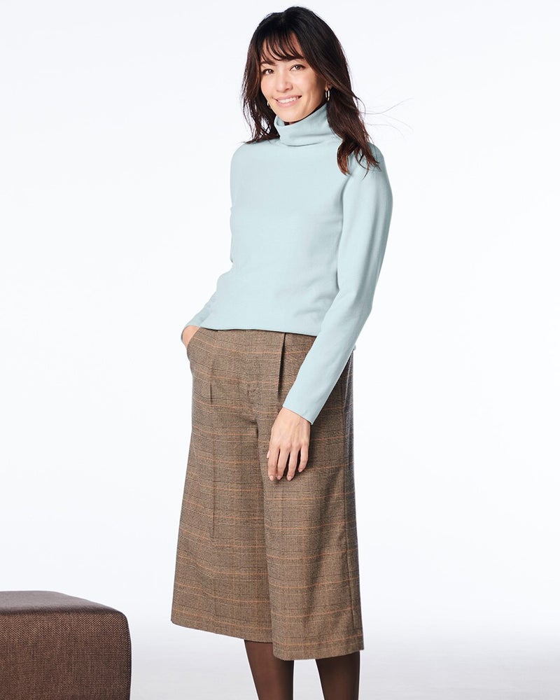 三菱ケミカル開発の高機能繊維ティミアンTMとレーヨンを複合して、カラダから発する汗や湿気を吸い取って熱に変えてくれる吸湿発熱機能を搭載。極細繊維ならではのベロアタッチのなめらかな着心地とどんなコーデにもマッチするベーシックデザインで大人の冬をお洒落に快適に。