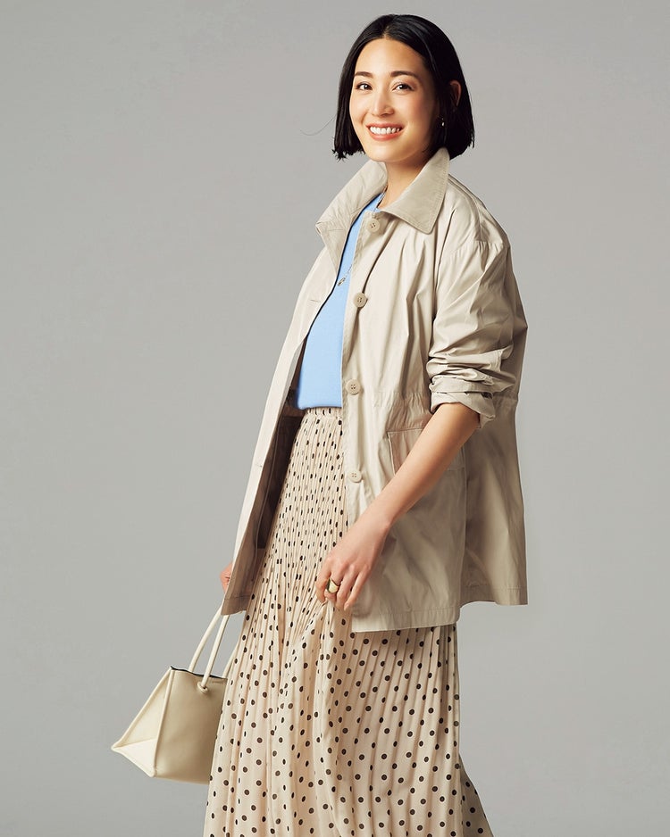 ❰Point.1❱ 1枚仕立てで軽く、携帯性も優秀。畳みジワが寄っても手ですぐに伸ばせます。 ❰Point.2❱ ウエスト内側にドローコードを備え、フォルムを変えてお楽しみいただけます。 ❰Point.3❱ 合わせるボトムを選ばないショート丈のステンカラーコート。大きめ襟がほど良い抜け感をプラス。 ❰Point.4❱ 小さく畳んでカバンに入れたり、手持ちで携帯してできたシワも、さっと素早く手で伸ばせます。