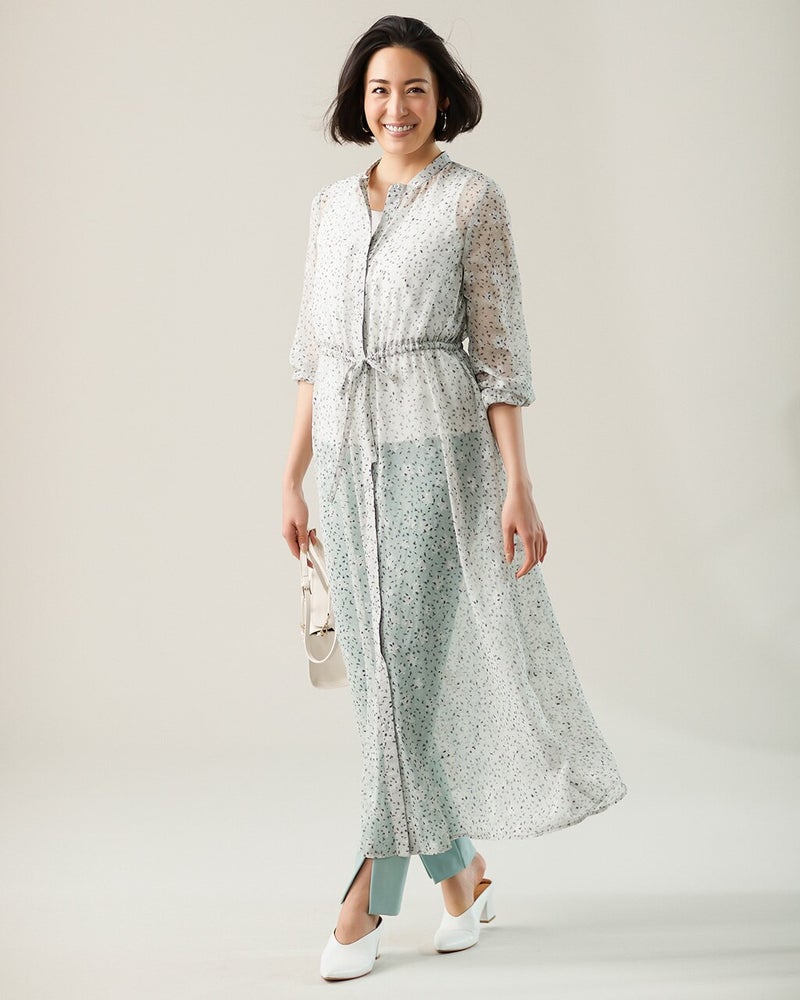 星柄のジャカード刺しゅうを施し、さらにその上から繊細なプリントを施した贅沢素材。シフォンならではの透け感が女らしい、ロマンティックなワンピースです。バンドカラーの前開きデザイン、ウエストシェイプでメリハリをつけたスタイルアップ効果も。インナー用のキャミソールワンピースが付属し、透けを気にせず着こなせます。