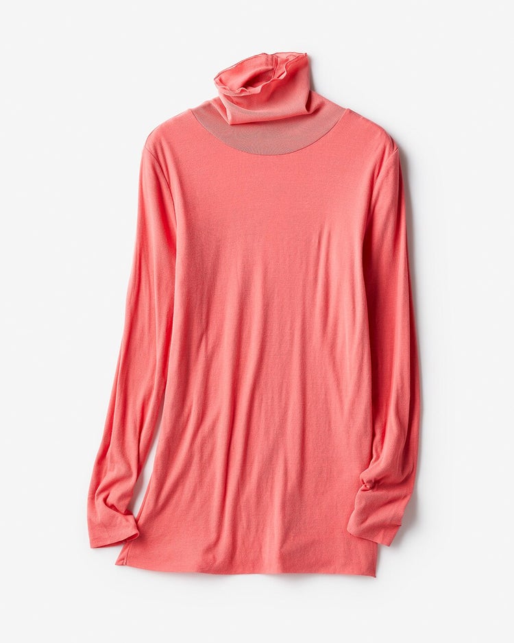 ハイネックの肌に当たる部分はコットンダブルガーゼ、その上にメロー仕立てのチュール素材をレイヤードしたヴェールのようなシアーハイネック。女らしい透け感と着心地の良さ、どちらも叶えた1着です。
