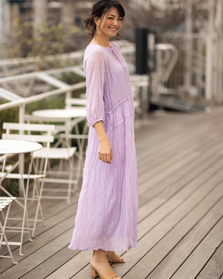 ほのかに素肌が透けるワッシャー生地で仕立てたワンピースは、リゾートに映える1着。ウエストサイドのリボンを絞ることで、フォルムのアレンジが可能です。インナーワンピース付き。