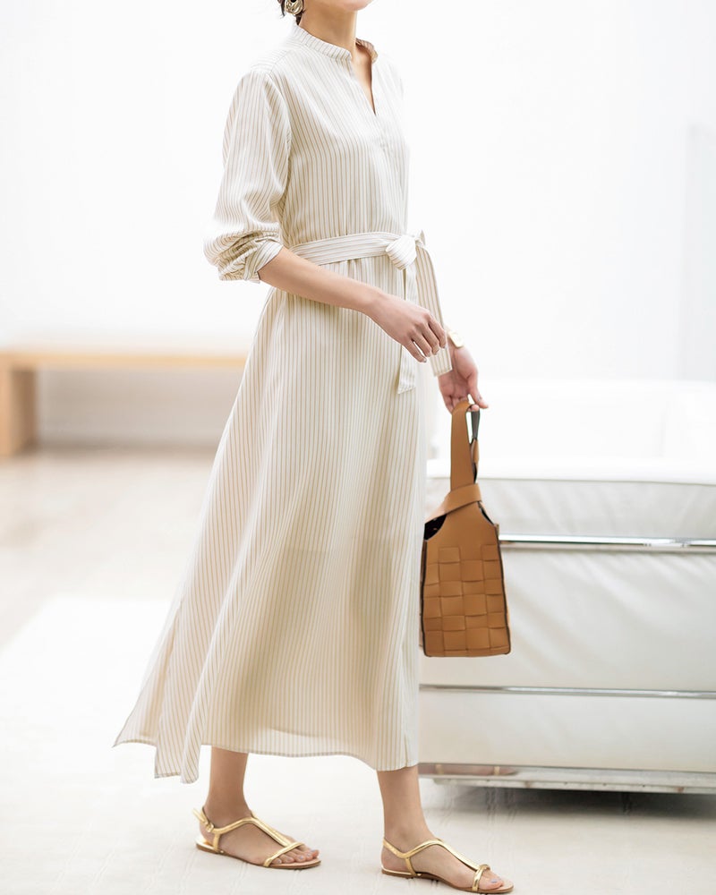 ほんの少しとろみ感を持つソフトな生地を、カシュクール風の粋なシャツワンピースに仕立てました。スタンドカラーのVネック、ウエストマークのデザインでぐっと細見せ。 ※こちらの商品は他商品に比べて全体にゆったりしたデザインのため、お客様のサイズよりワンサイズ下のサイズをお勧めしております。