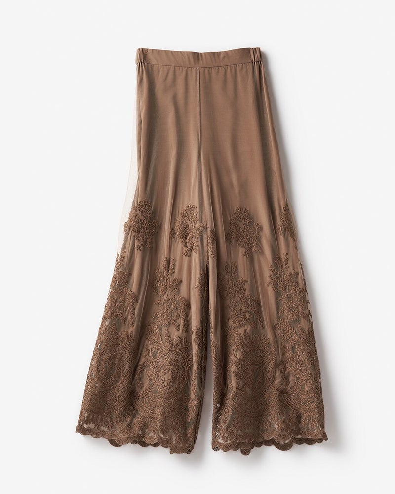 光沢のある生地に、華やかなチュールレースを重ねた贅沢仕立てのワイドパンツ。腰から太ももには刺しゅうを入れず、すっきりと。ほのかに肌が透けるスカラップレースが、足首を繊細に彩ります。