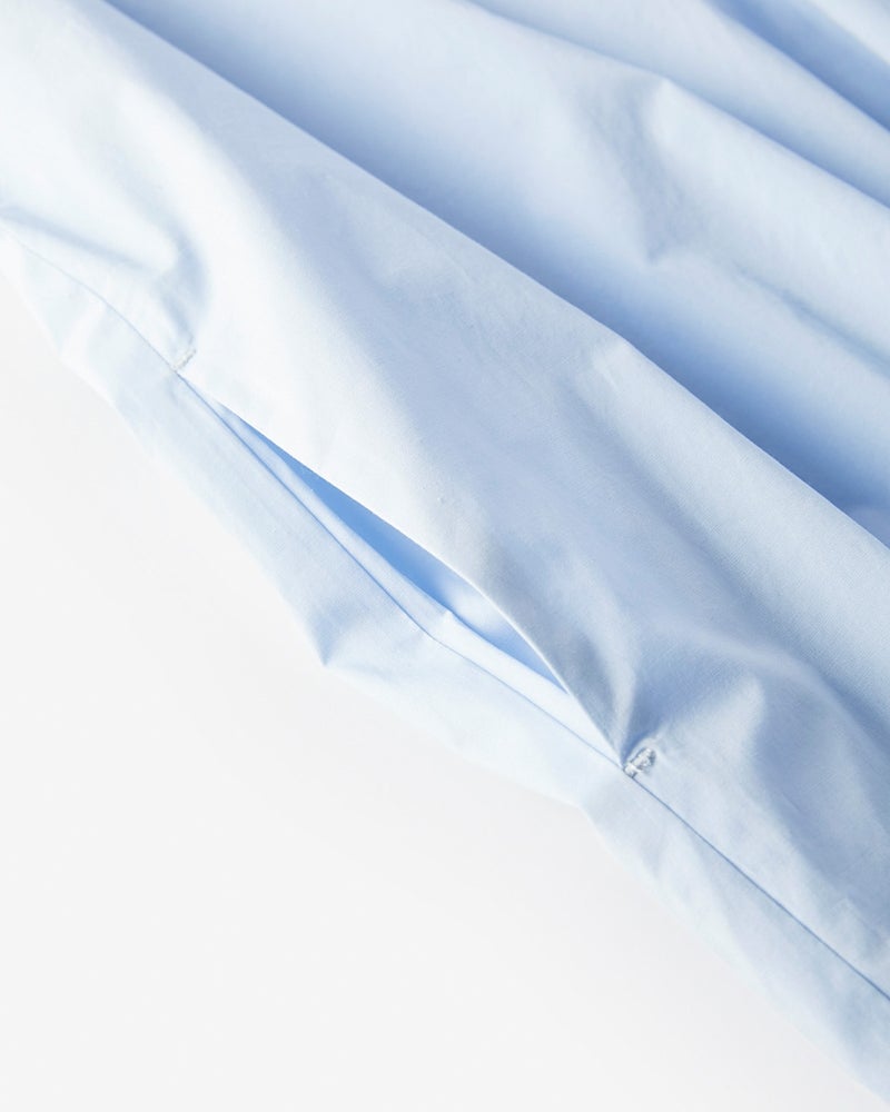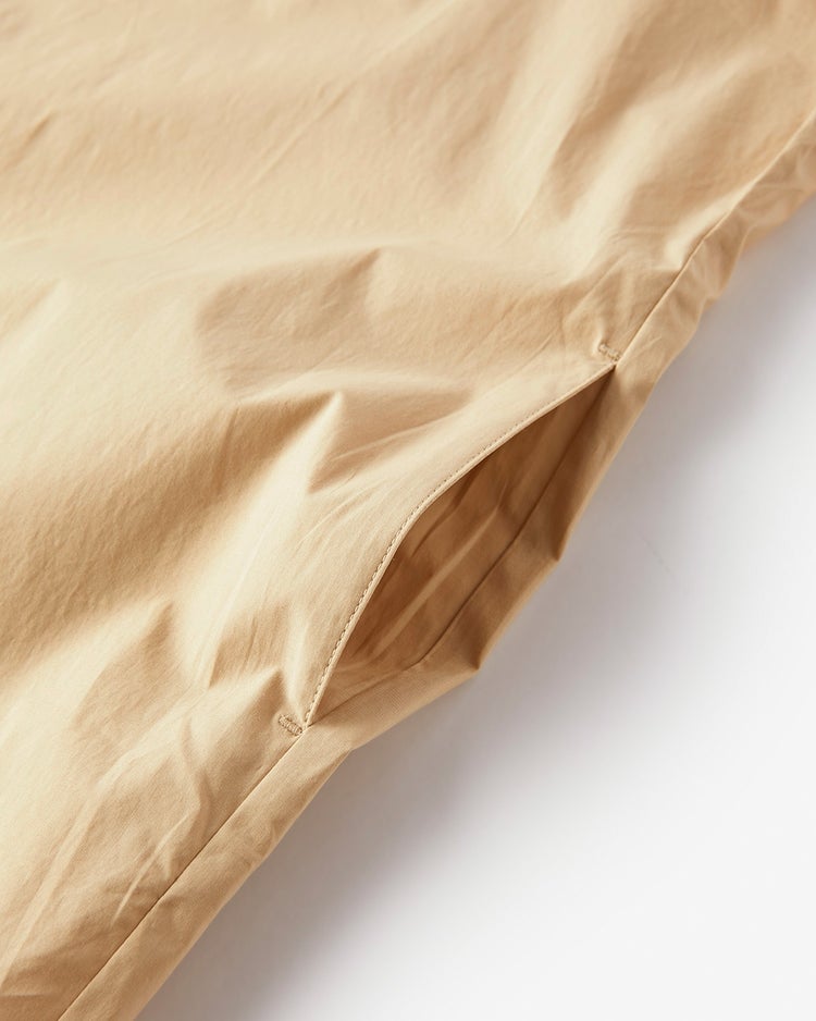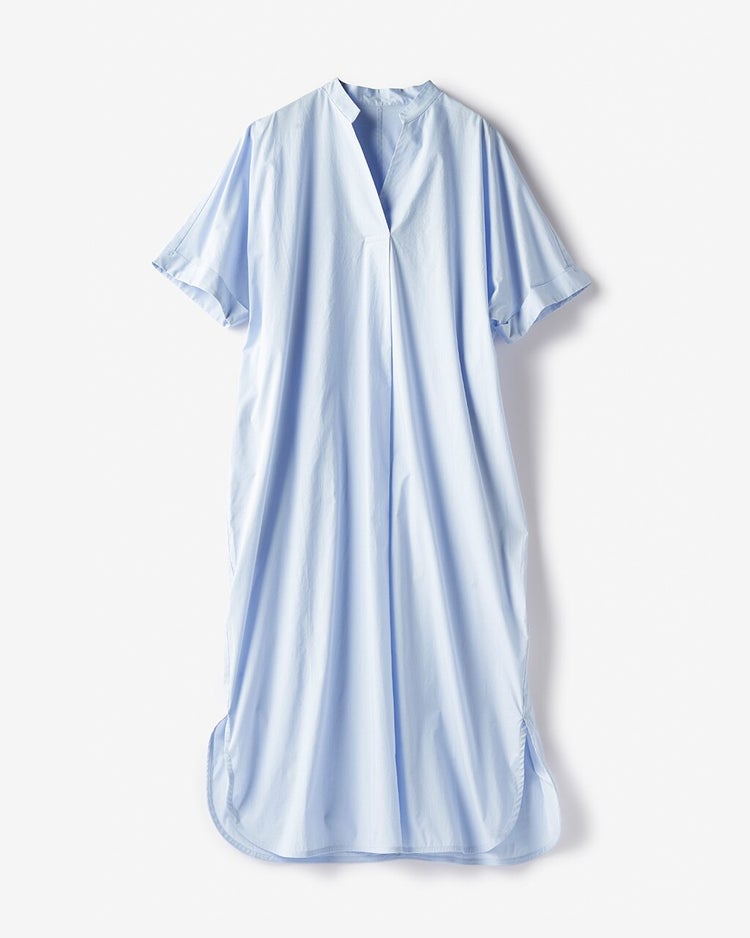 綿にポリウレタンをミックスし、伸縮性をもたせた素材を使用。ドルマンスリーブのリラクシーなデザインを、わずかに衿を立ち上げたシャープなキーネックで引き締めました。パンツ合わせでカジュアルに着こなしても。