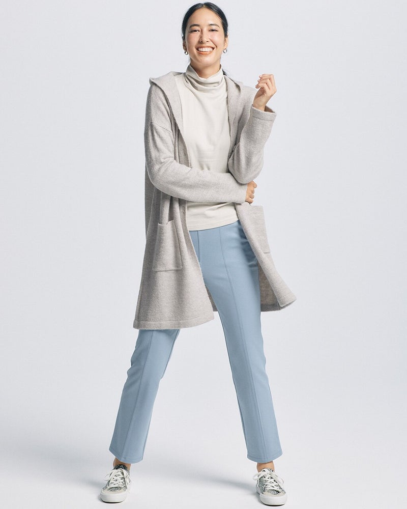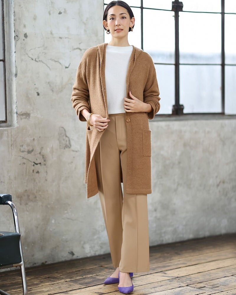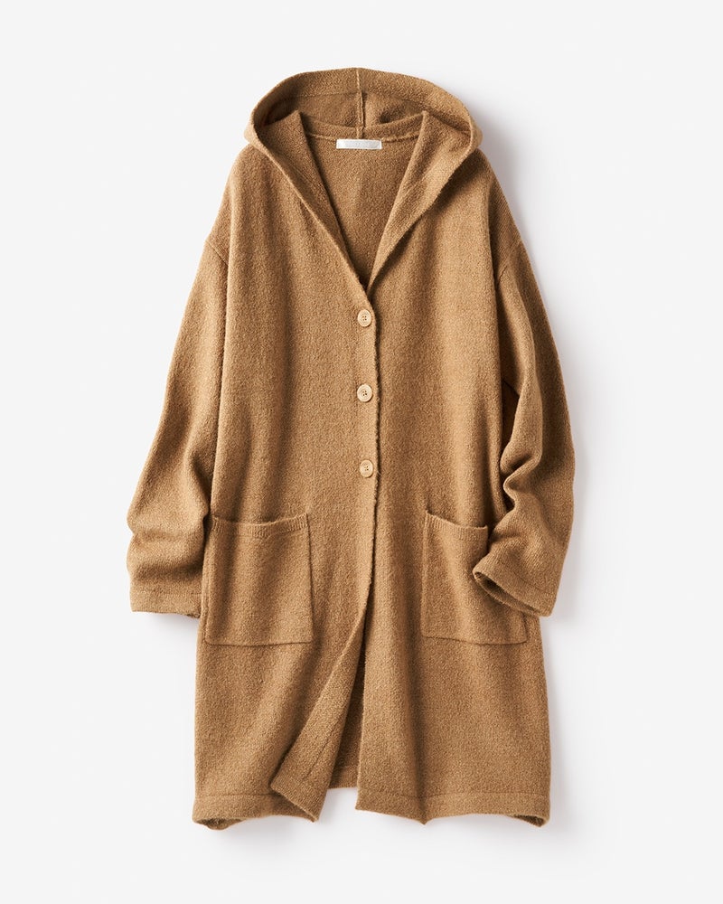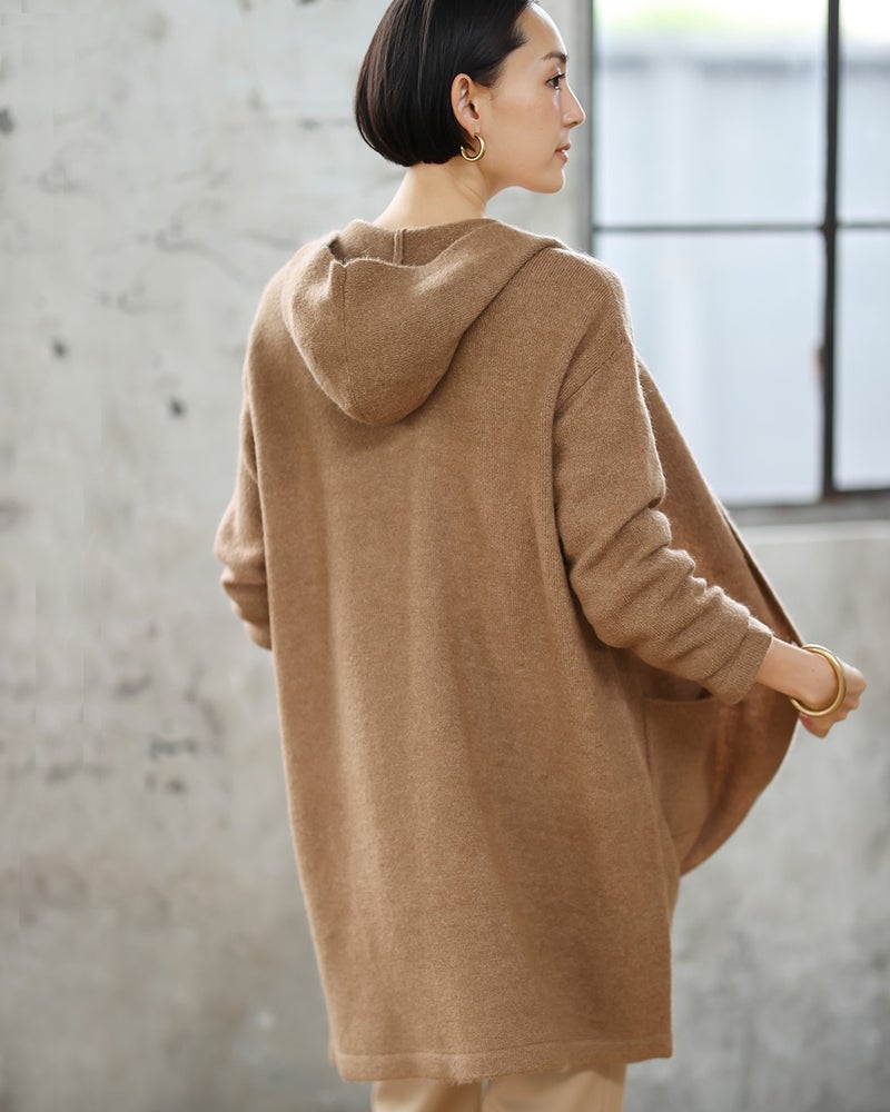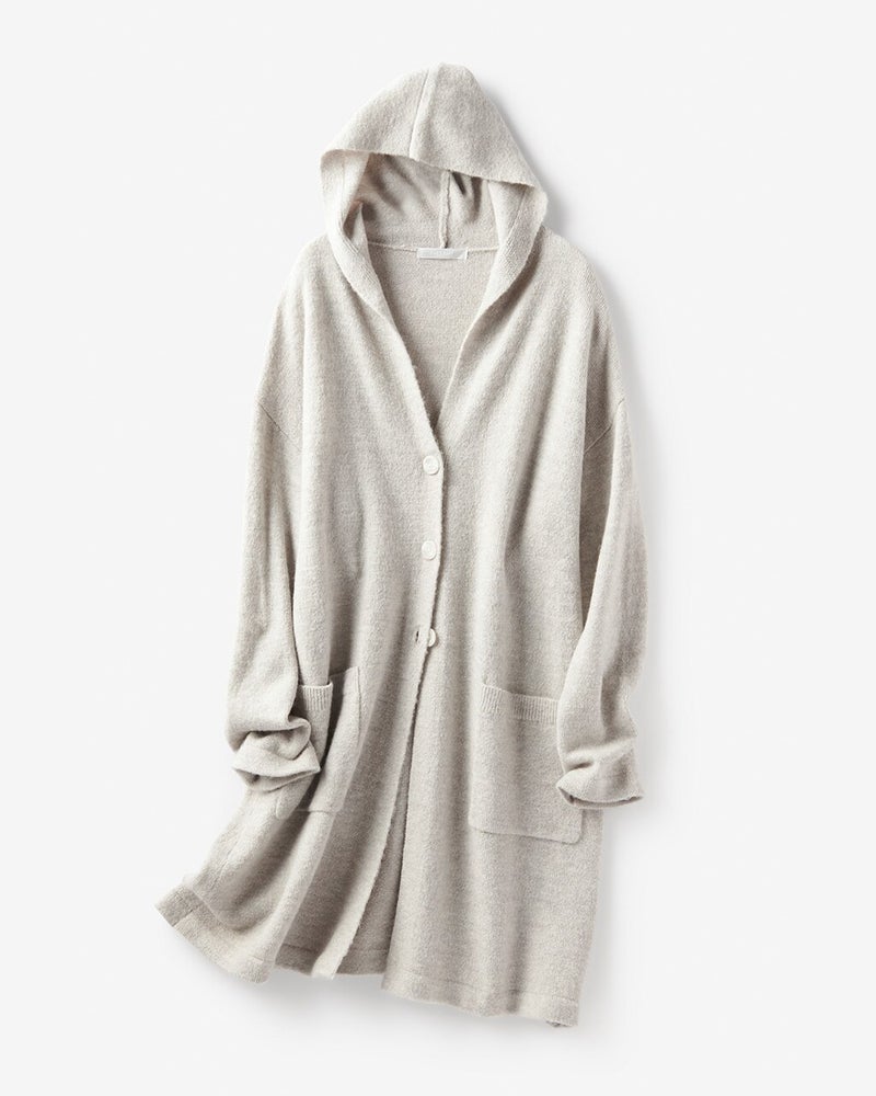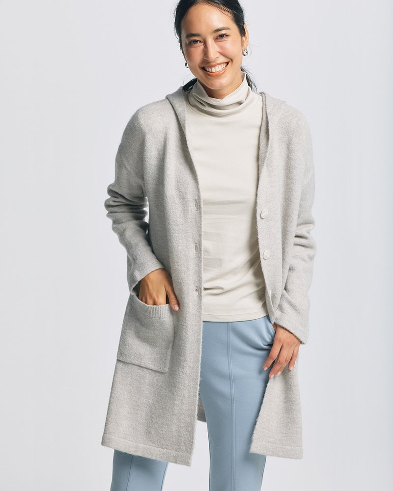 コートにはまだ早い季節の、毎日の着こなしに大活躍するのが柔らかなニットアウター。パンツにもスカートにも合わせやすいロングフーディのデザインをご用意しました。