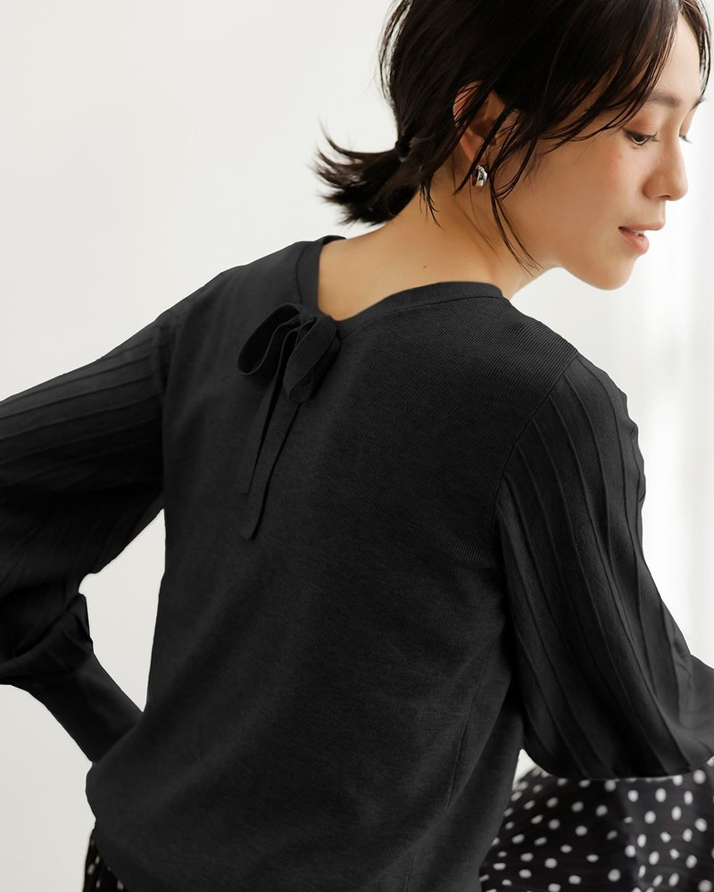 POINT3.一枚で着映えするデザインニット背中にリボンをあしらった、バックシャンなニット。ハリのある総針編みの身頃と、ピンタックのボリューム袖という、編地の切替えも楽しいデザイン。スカートと合わせて女らしく、パンツと合わせて甘辛コーデに、着回し自在のデザインニットです。