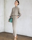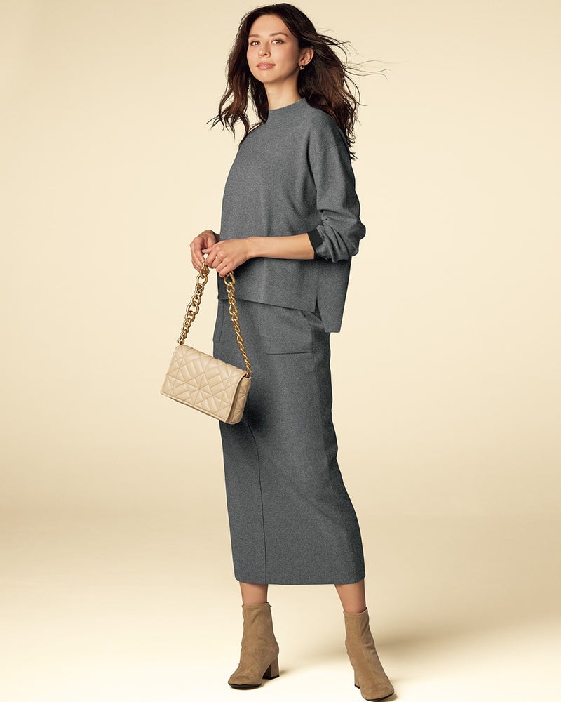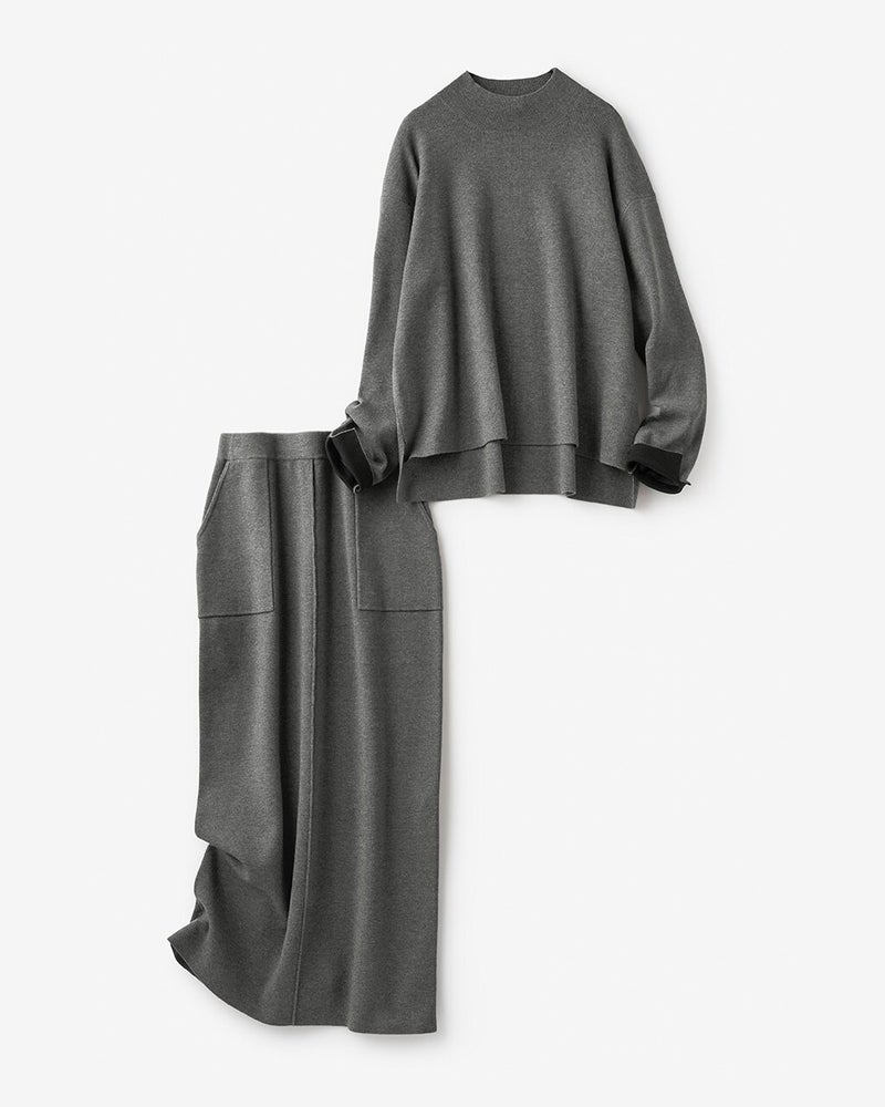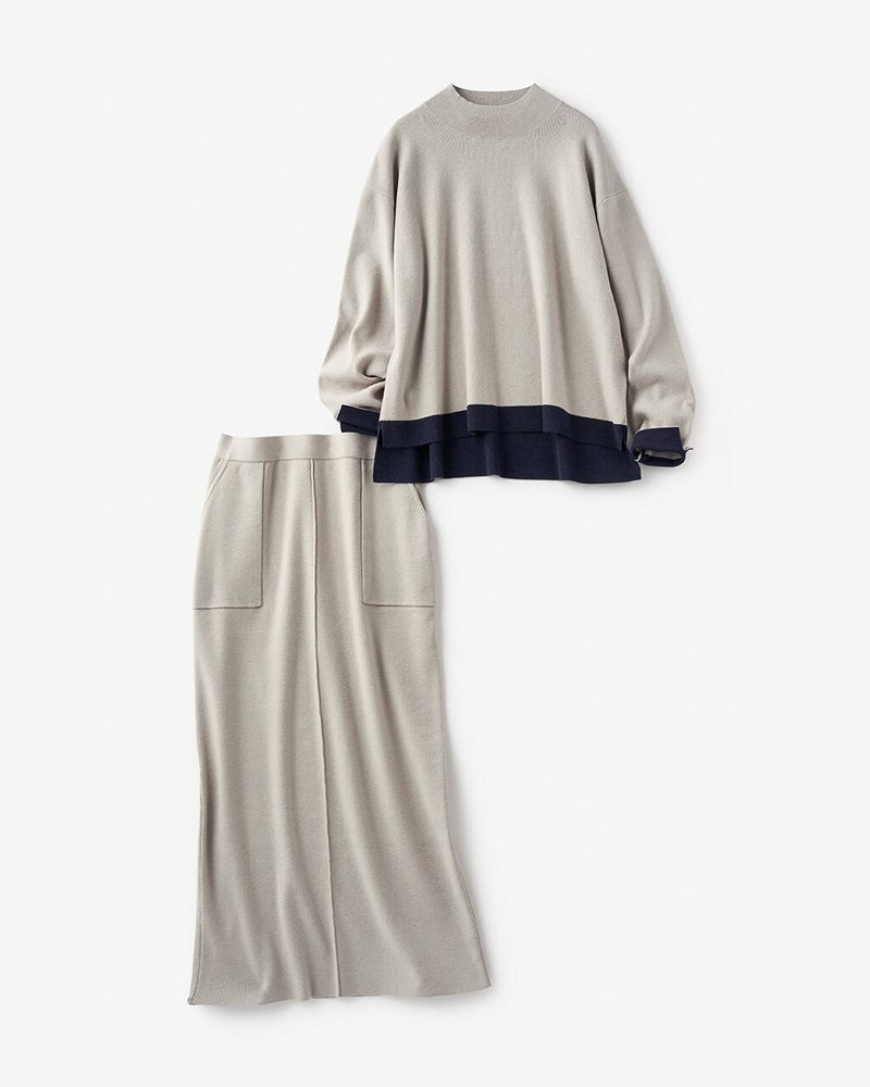 ハリのある総針編み仕立てが、すっきりきれいを叶えるニットのセットアップ。ハイネックのトップスに、ロングスカートをセットに。カラーも豊富に揃え、059.グレーパターンはトップスの袖裏、裾のラインを配色で切り替えたデザインです。