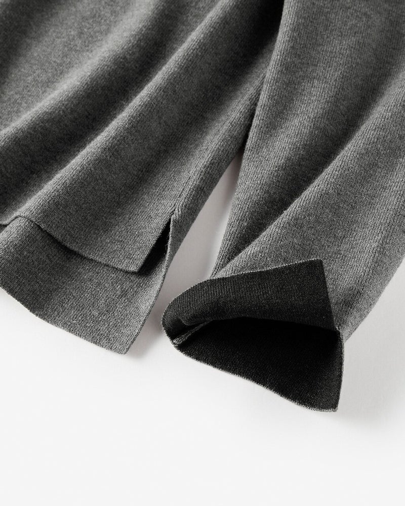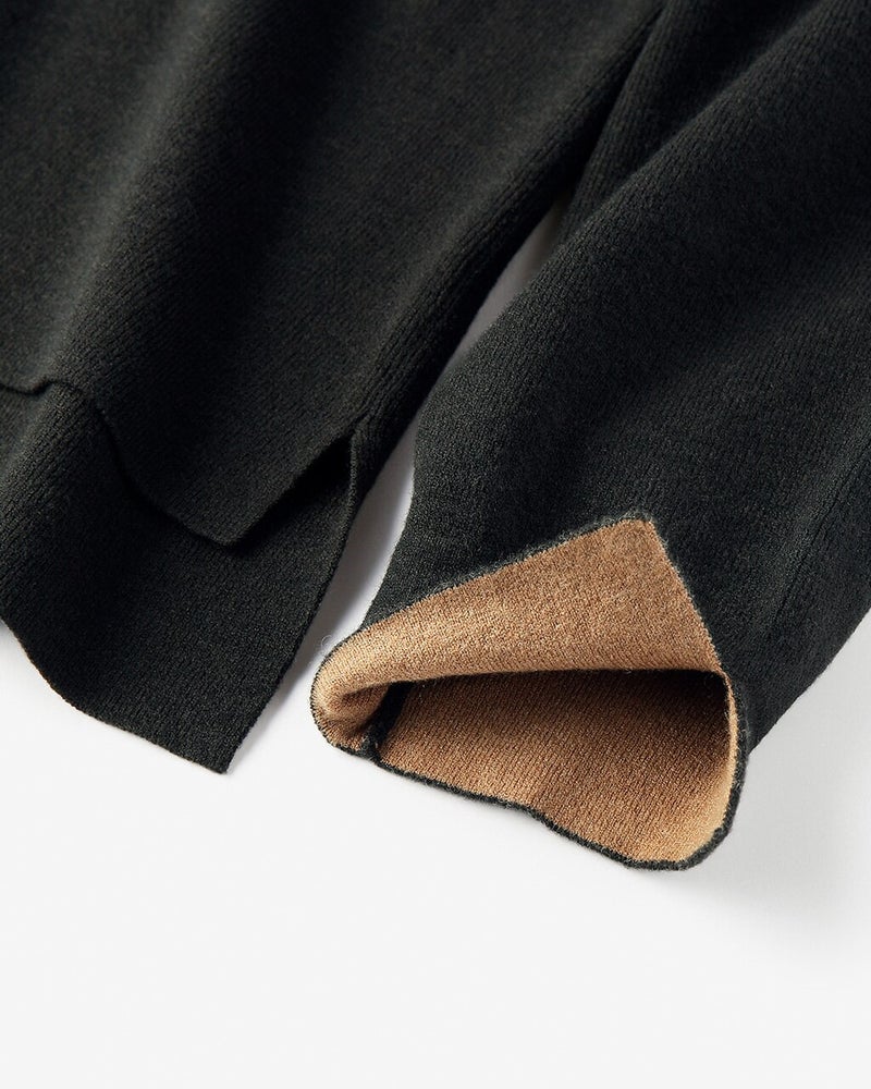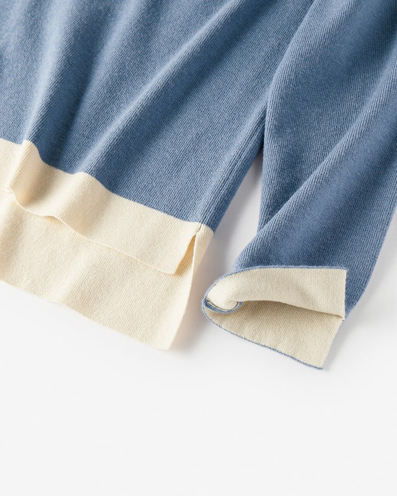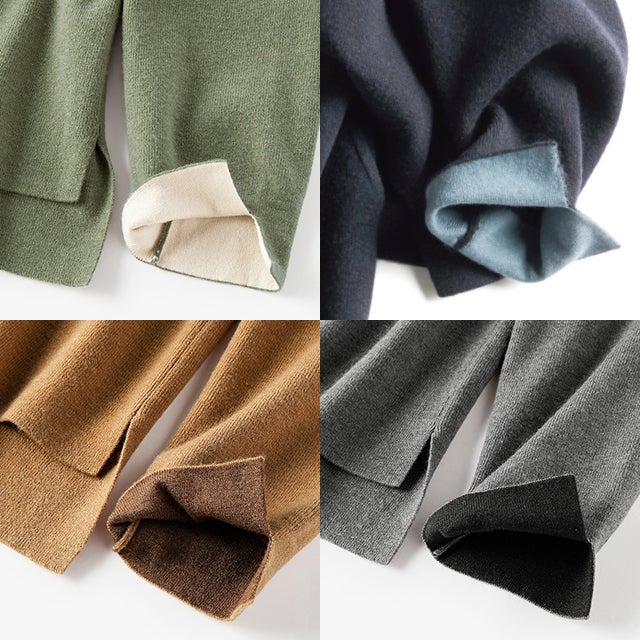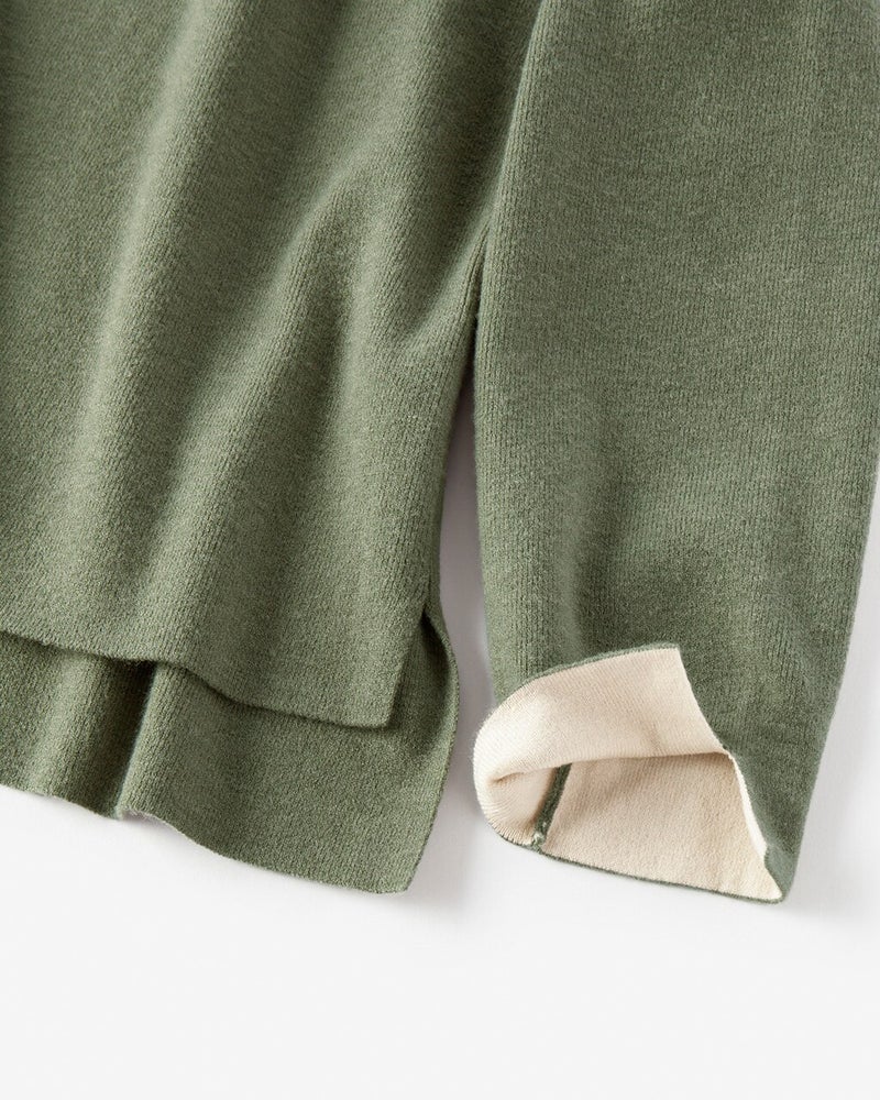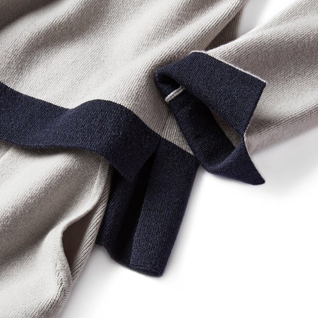 柔らかな杢調のニットの袖口に、配色でアクセントを効かせたデザイン。グレーパターンはトップスの裾にも配色を効かせ、スタイリッシュに仕上げました。