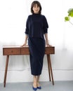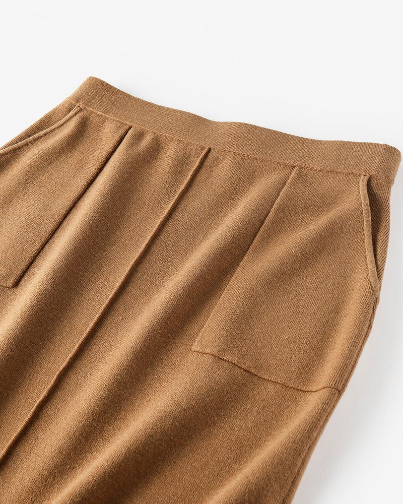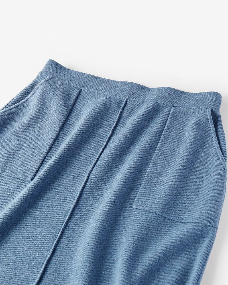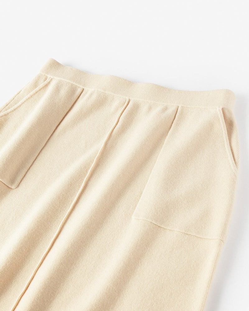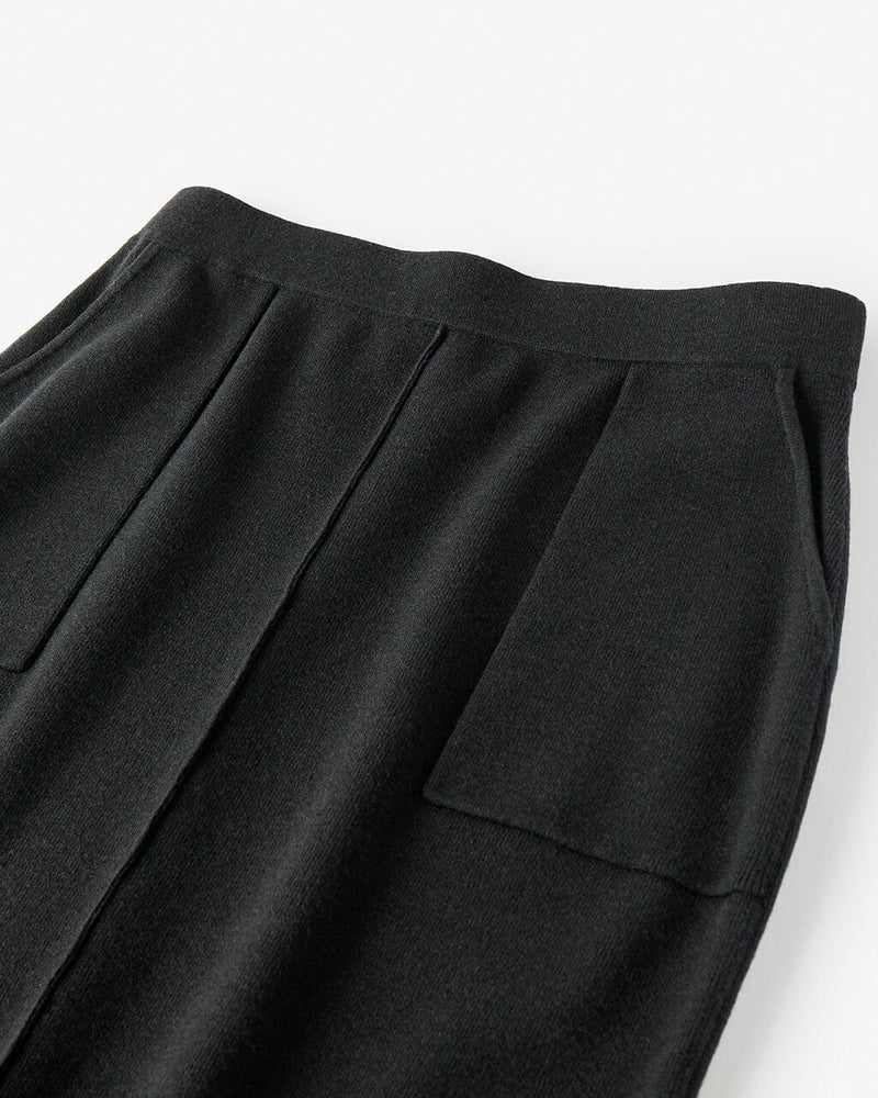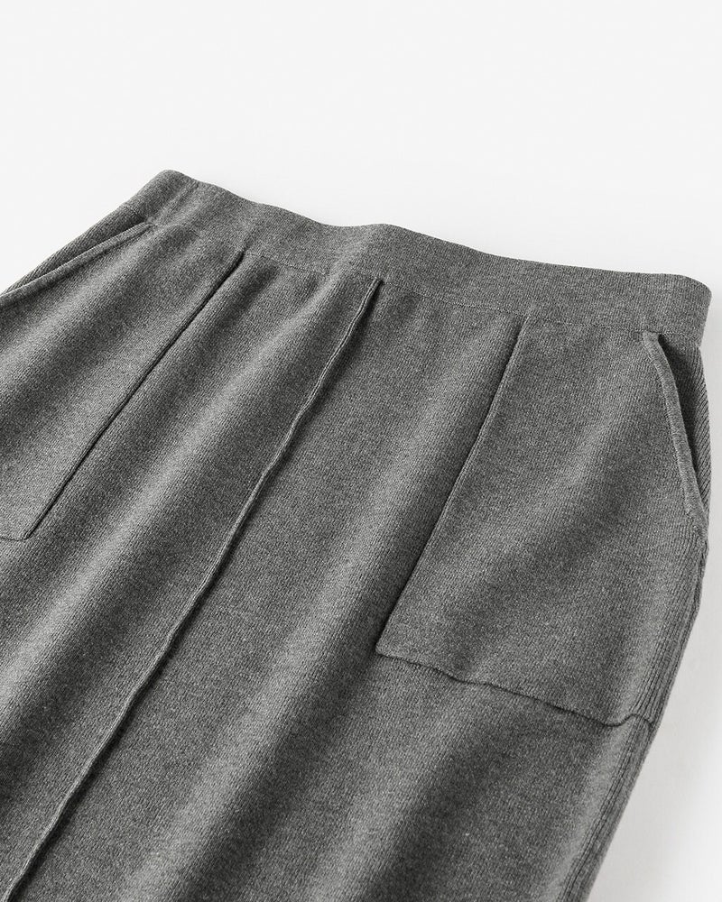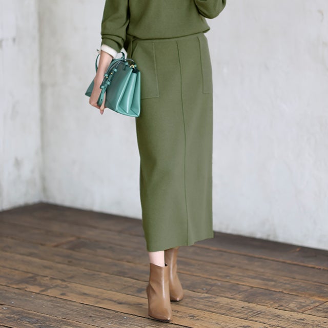 スカートはトップスよりもストレッチ糸を多く使って厚みを出し、体型が響きにくいように仕上げました。ボディラインにつかず離れずの筒幅と、センターラインやポケットの視覚効果でほっそり見えを演出。
