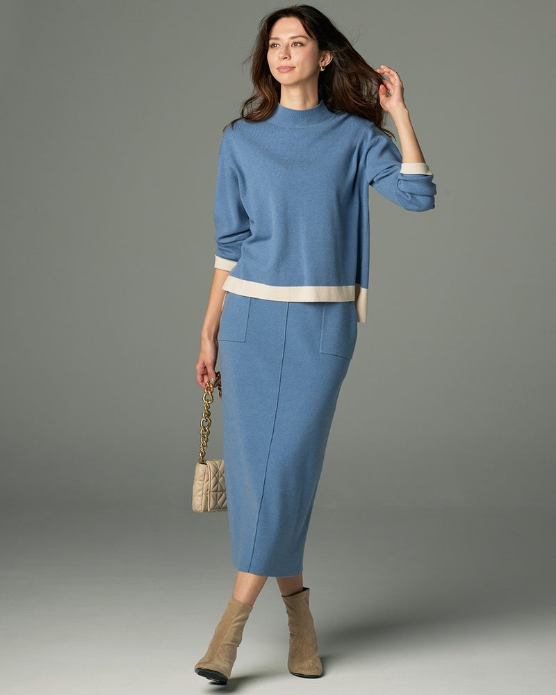 • 総針ハイネック・スカートセットアップ 詳細画像 ブルー・パターン 1