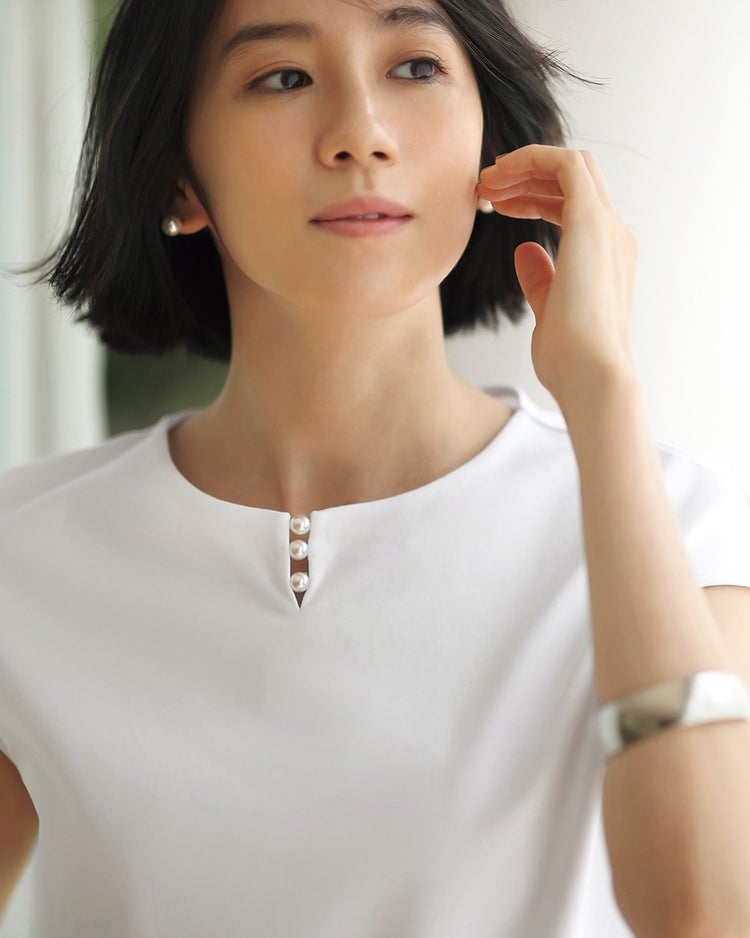 - すっきりしたシルエットで、生地もしっかりしています。襟あきもちょうどよく、1枚でもジャケットのインナーとしても着られます。パール状の飾りも大人っぽくていいですね。