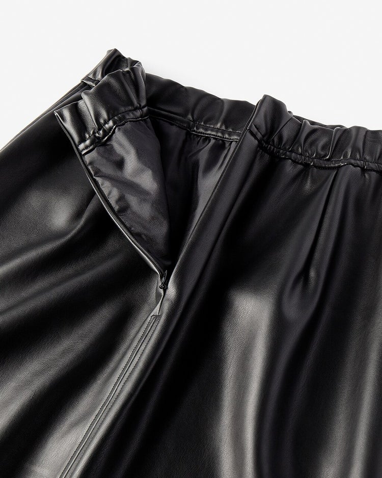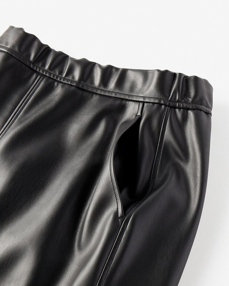 近頃注目のしなやかで薄手のエコレザー素材で、すっきりはけるロングタイトスカートを作りました。ほっこりニットと合わせてもクールな大人の雰囲気に。足さばきの良いバックスリット入り、後ろウエストゴムで楽々なはき心地にもこだわりました。