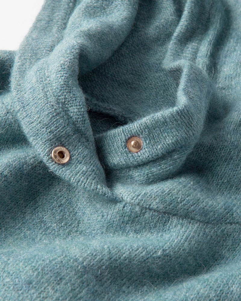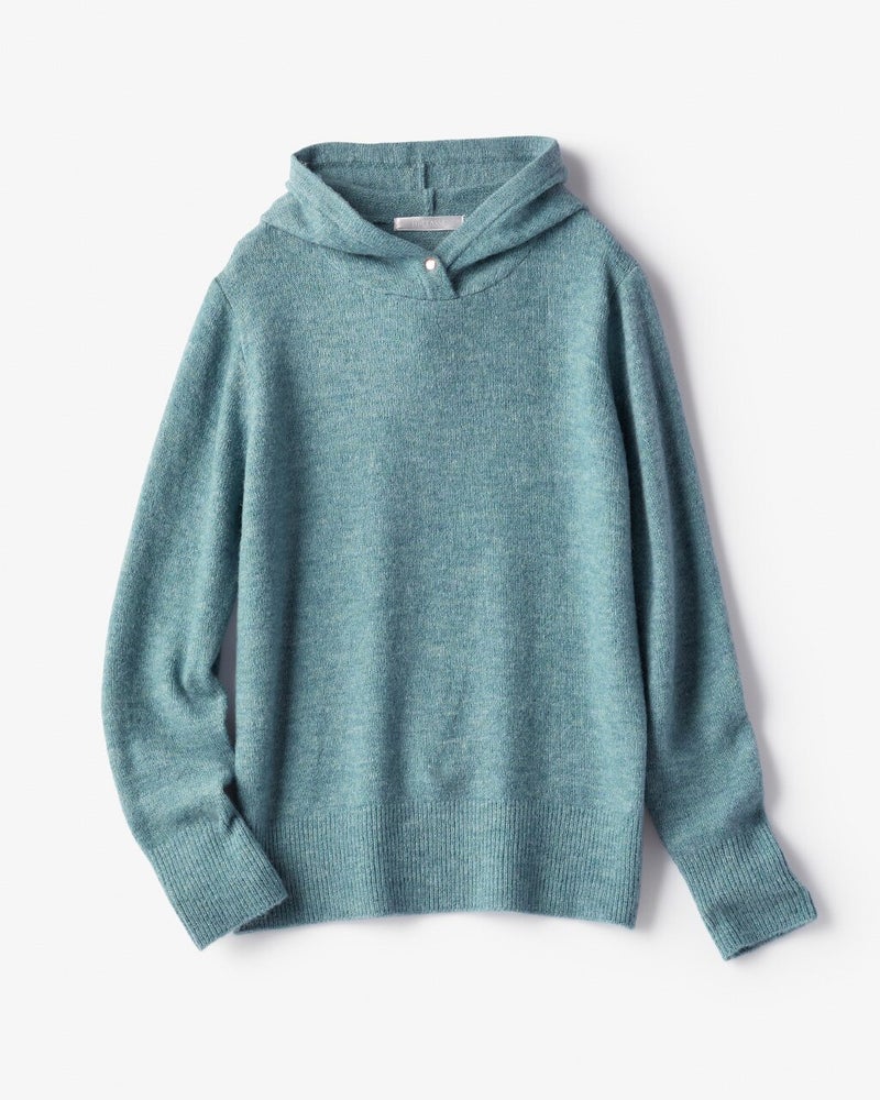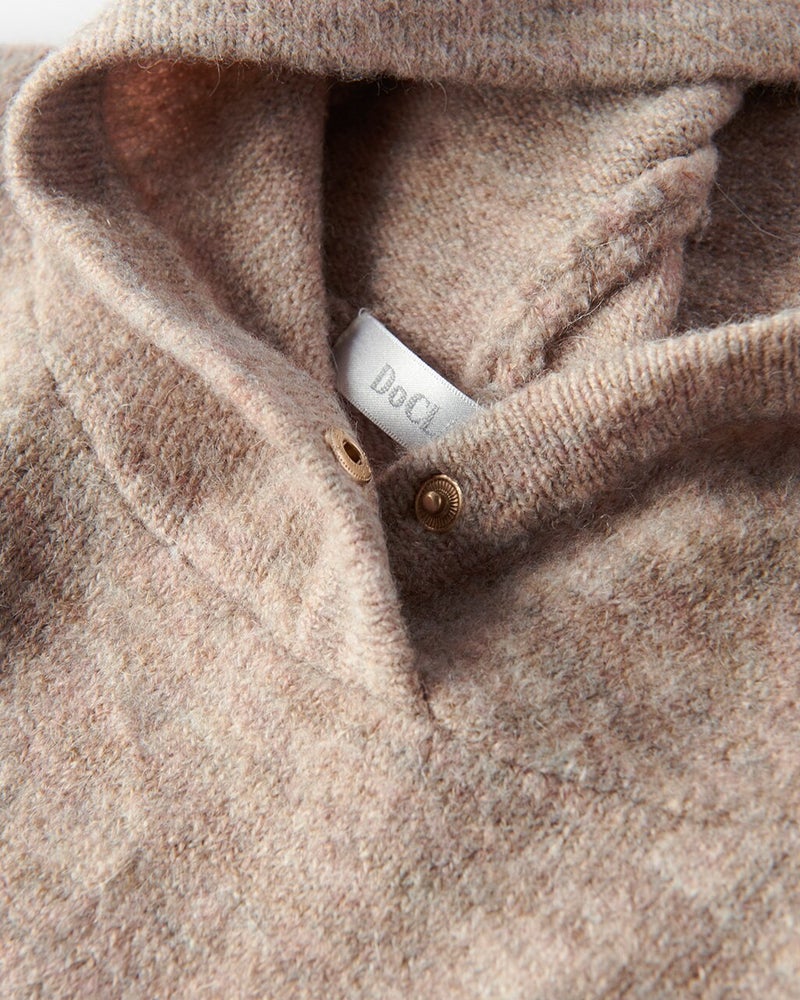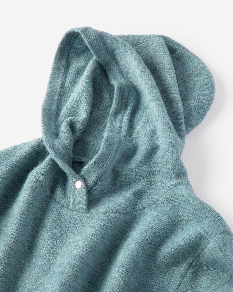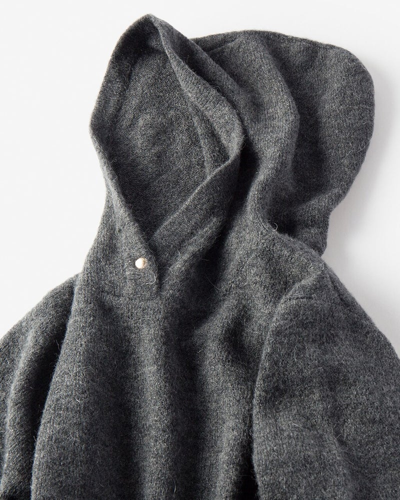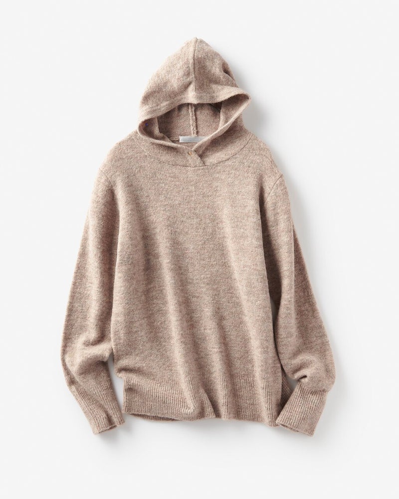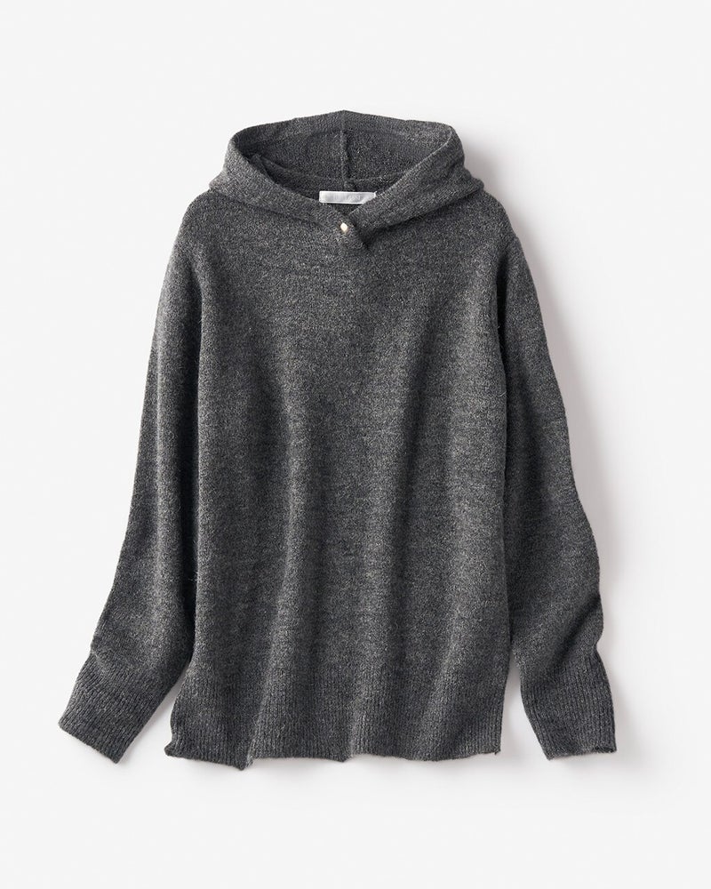 モヘヤ混でふわふわ軽やかなメランジニットで仕立てた、大人フーディ。衿もとにあしらったドットボタンが首もとで暖かくカバーしながら、フードを立体感あるフォルムに保ちます。