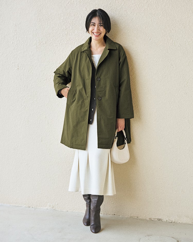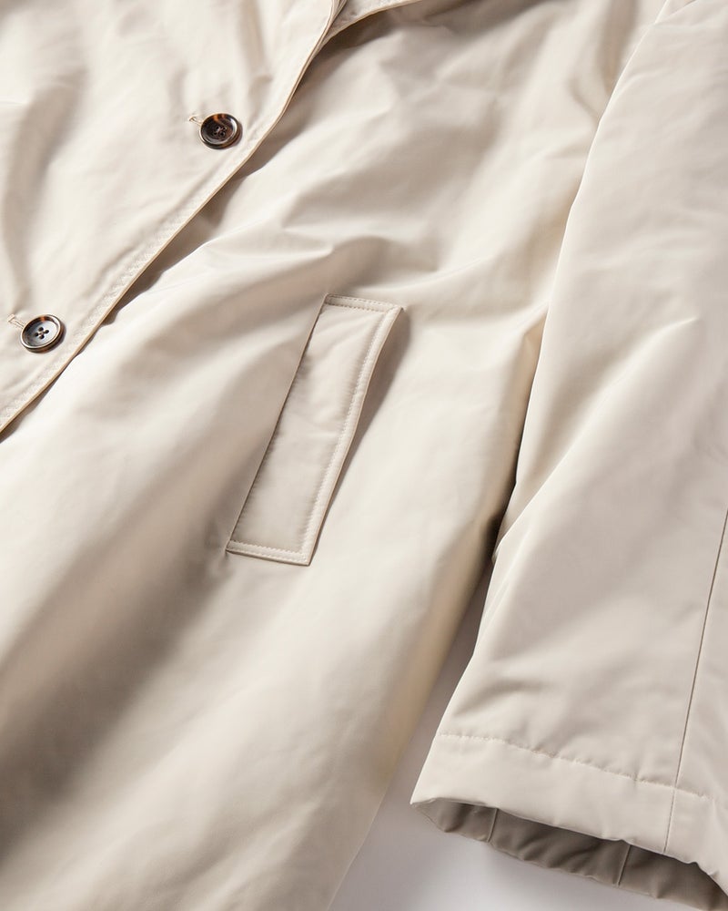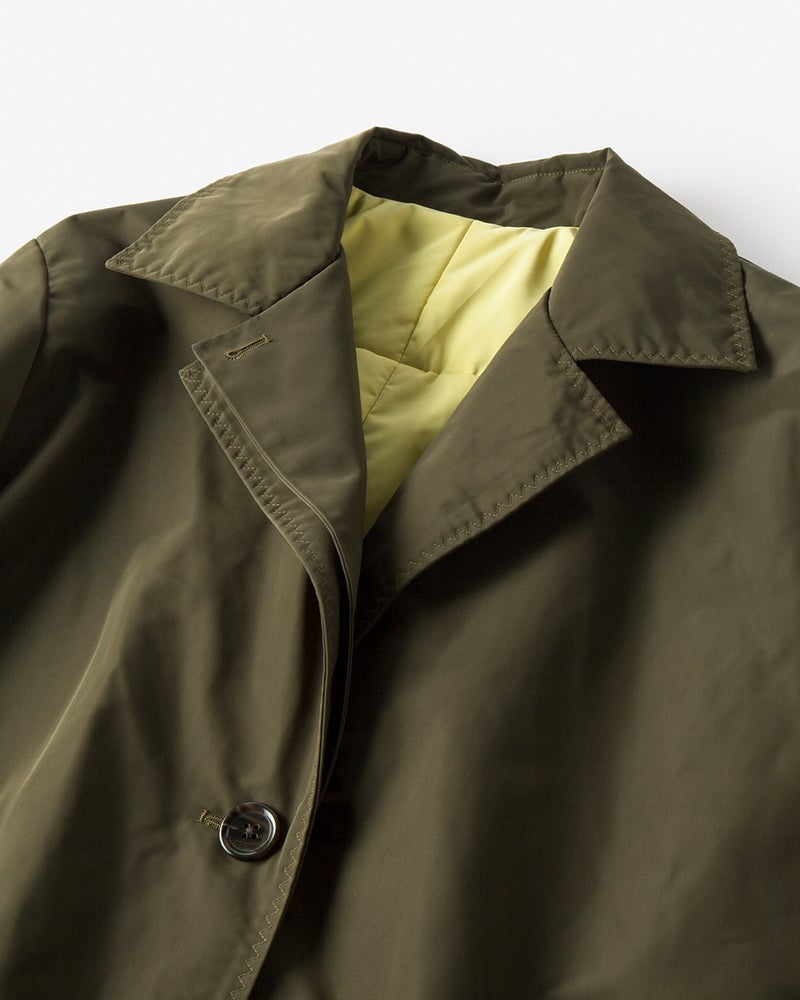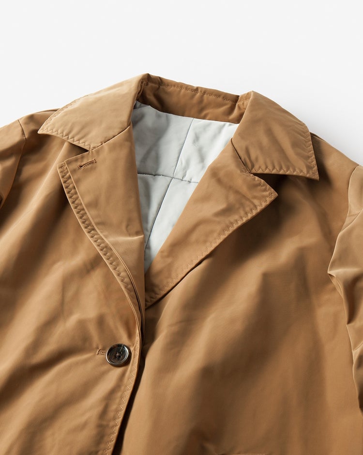緻密に織りあげた、ハリと艶の美しいグログラン素材をオモテ面に採用。より上質で、フォルムの美しさが際立つ1着に。オモテ面は雨や雪をはじく撥水加工済。