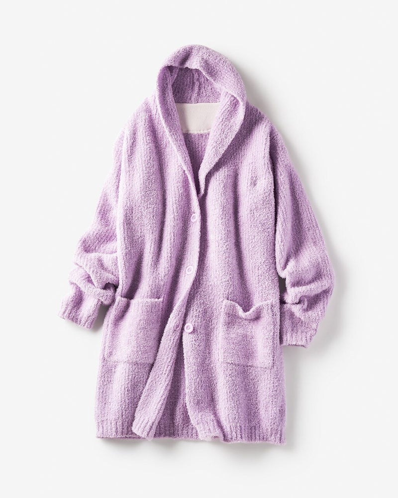 タクテルモール糸に高機能性繊維NANOMIX(R)をブレンドして編み立てた(特許出願中)、ふんわりとろける感触の片畦編みのフード付きカーディガン。お尻の隠れる長め丈で、腰まわりもじんわりぽかぽか。大きめのフードが冷えやこりの気になる首から肩にかけて、心地良いぬくもりで包みます。