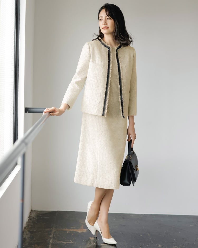 公式の場でも恥ずかしくない本格仕立てのツイードアイテムですが、ワンピースならちょっとしたお出かけにも使える応用範囲の広さも魅力。