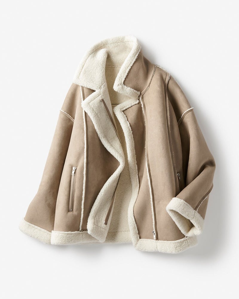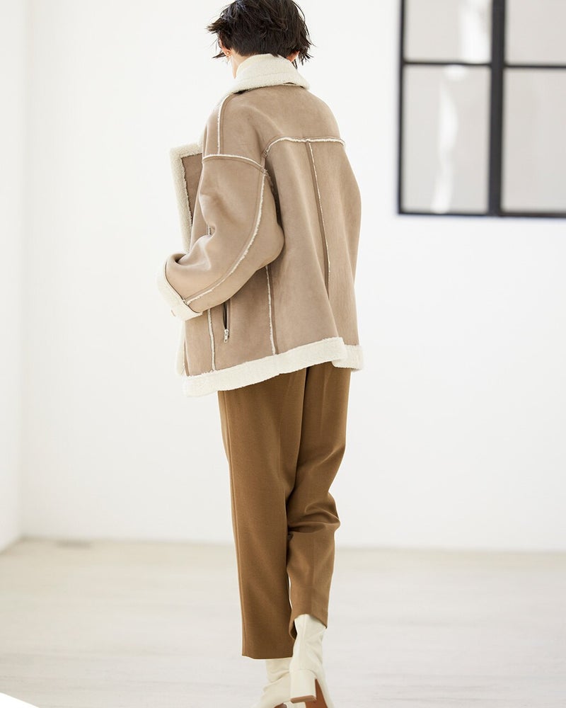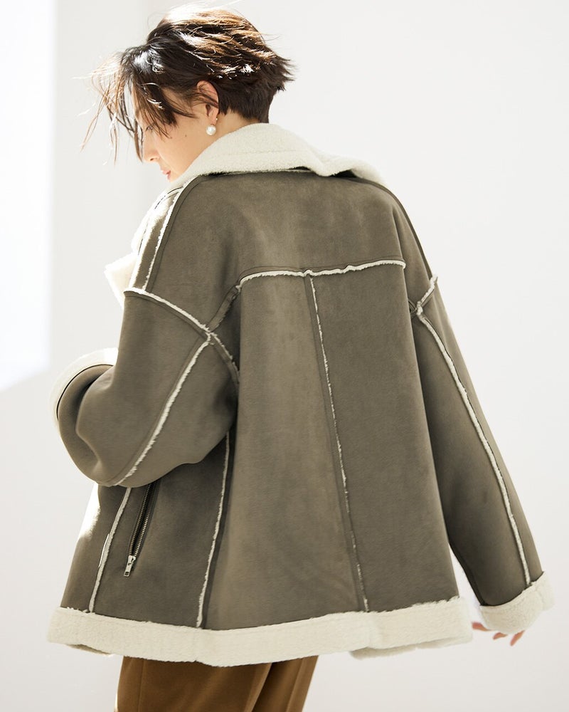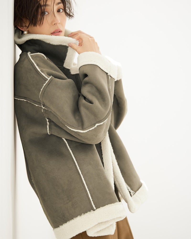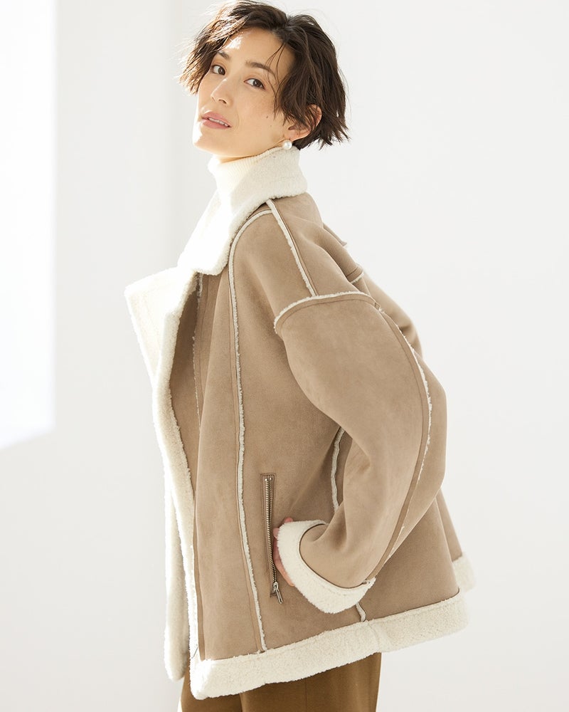 辛口デザインのライダースも、ムートン素材ならやさしい印象に。厚みのある生地感ながら、縦のラインを効かせることで、細見えするデザインに。スエード×ボアのコントラストも、羽織るだけで着こなしにメリハリをプラスします。