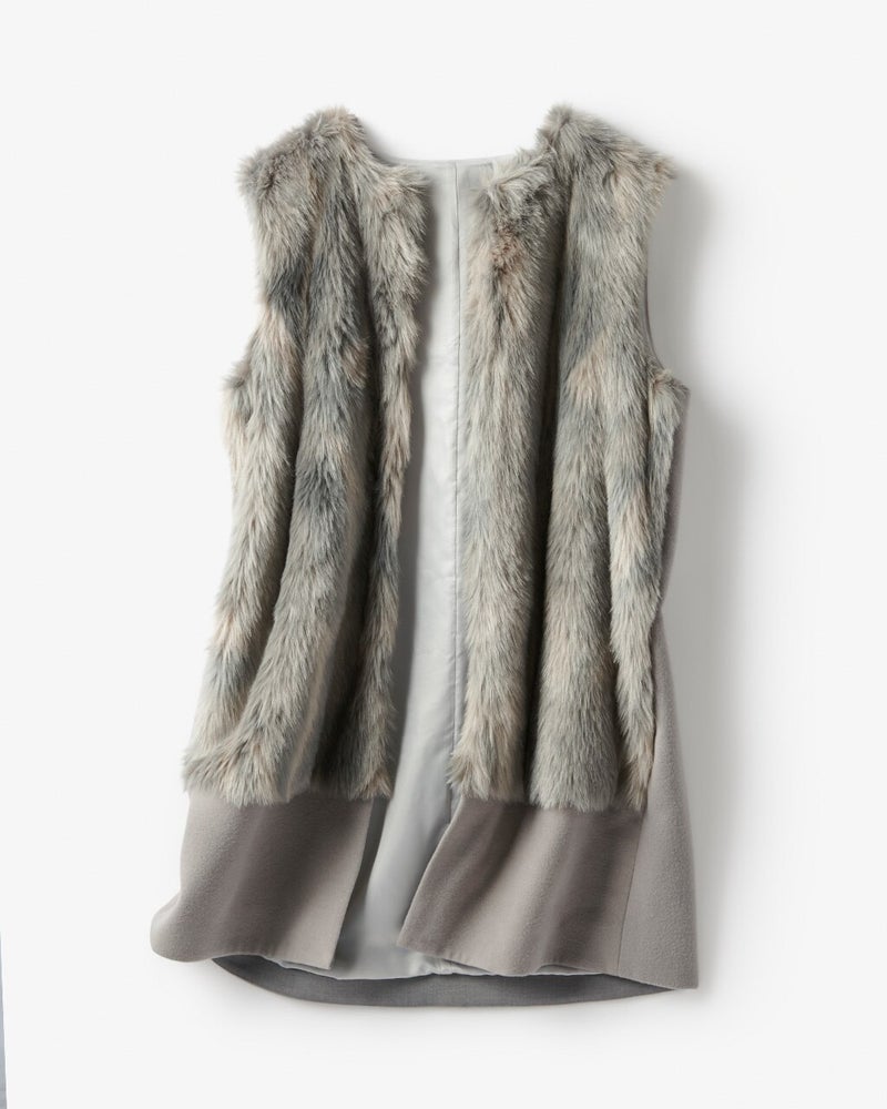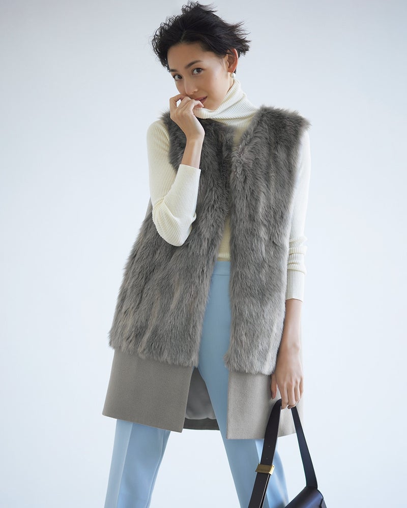 なめらかな感触の高品質エコファーで仕立てたジレは、着こなしに旬のスパイスを利かせつつ、体型カバーできる便利なアイテム。裾や背面をメルトン生地で切り替えてボリューム感を抑え、着ぶくれしにくいデザインに仕上げました。