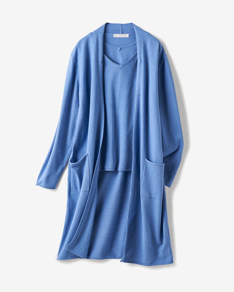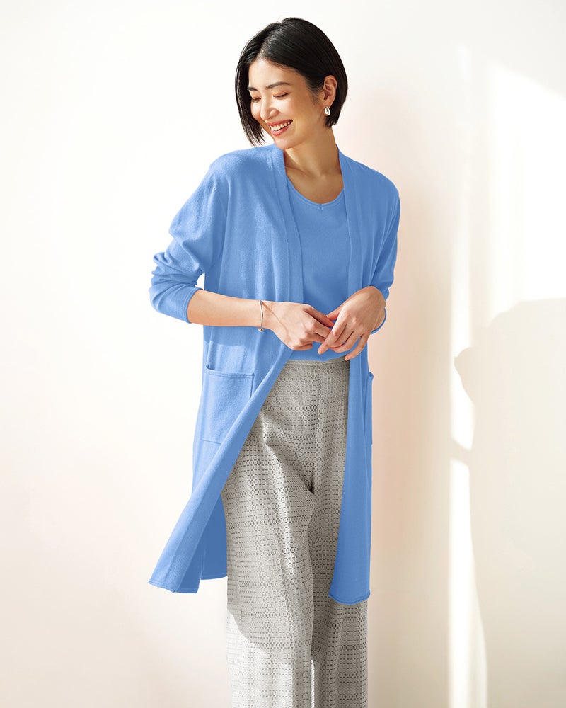 - なめらかで手触り良し、薄手で軽くて着心地良しですが、ノースリーブがすこし頼りなくて人前でカーディガンは脱げない感じ。ノースリーブだけでももう少し全体にゆとりや長さ、厚みが欲しかったです。