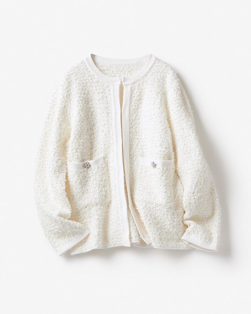 お仕事やよそいきのランチ、セレモニーの羽織りものとしても活躍! 着心地ラクラクで品格スタイルを完成させる、ニット仕立てのツイード風ジャケットカーデ。リボンヤーンならではの立体的な編地やパール×ビジューの華やかボタンで、羽織るだけでさりげなく華やかに。
