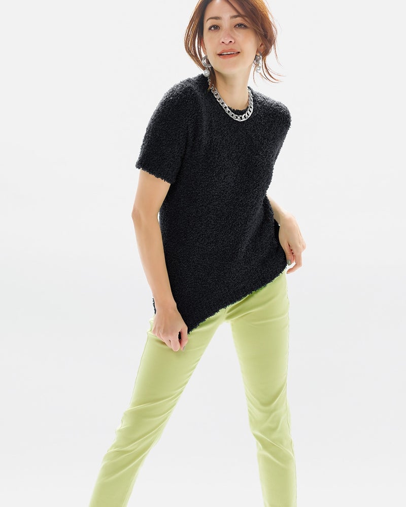ぬいぐるみのようにモコモコ、柔らかな着心地のリボンヤーンニット。着慣れたパンツもシンプルなスカートも、華のあるコーデに格上げしてくれます。背中にブランドロゴのメタルプレート付き。