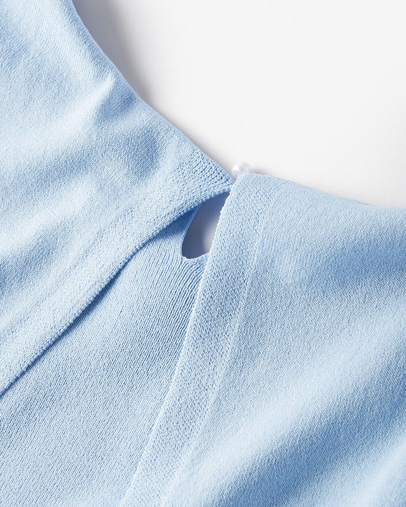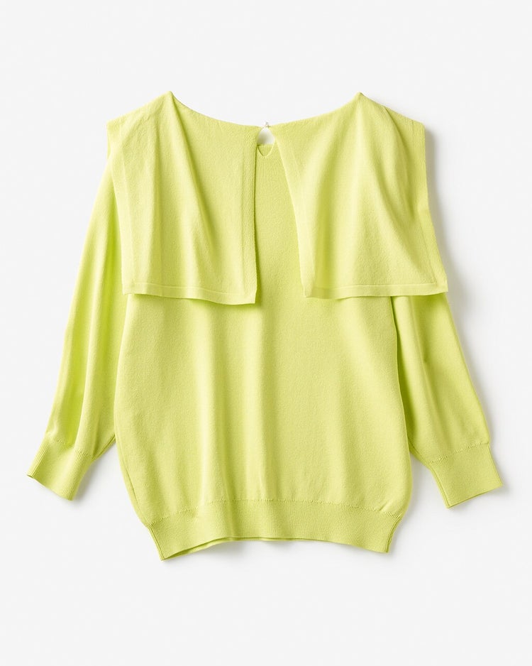 トレンド継続中の大きめ衿。ブラウスはちょっと普段使いしにくいという方にはニットがおすすめです。スクエアカラーの総針編みニットは適度なハリ感があり、体型カバーしながらきちんと見えする1着。後ろ姿に、パール風ボタンが可憐なきらめきを添えています。